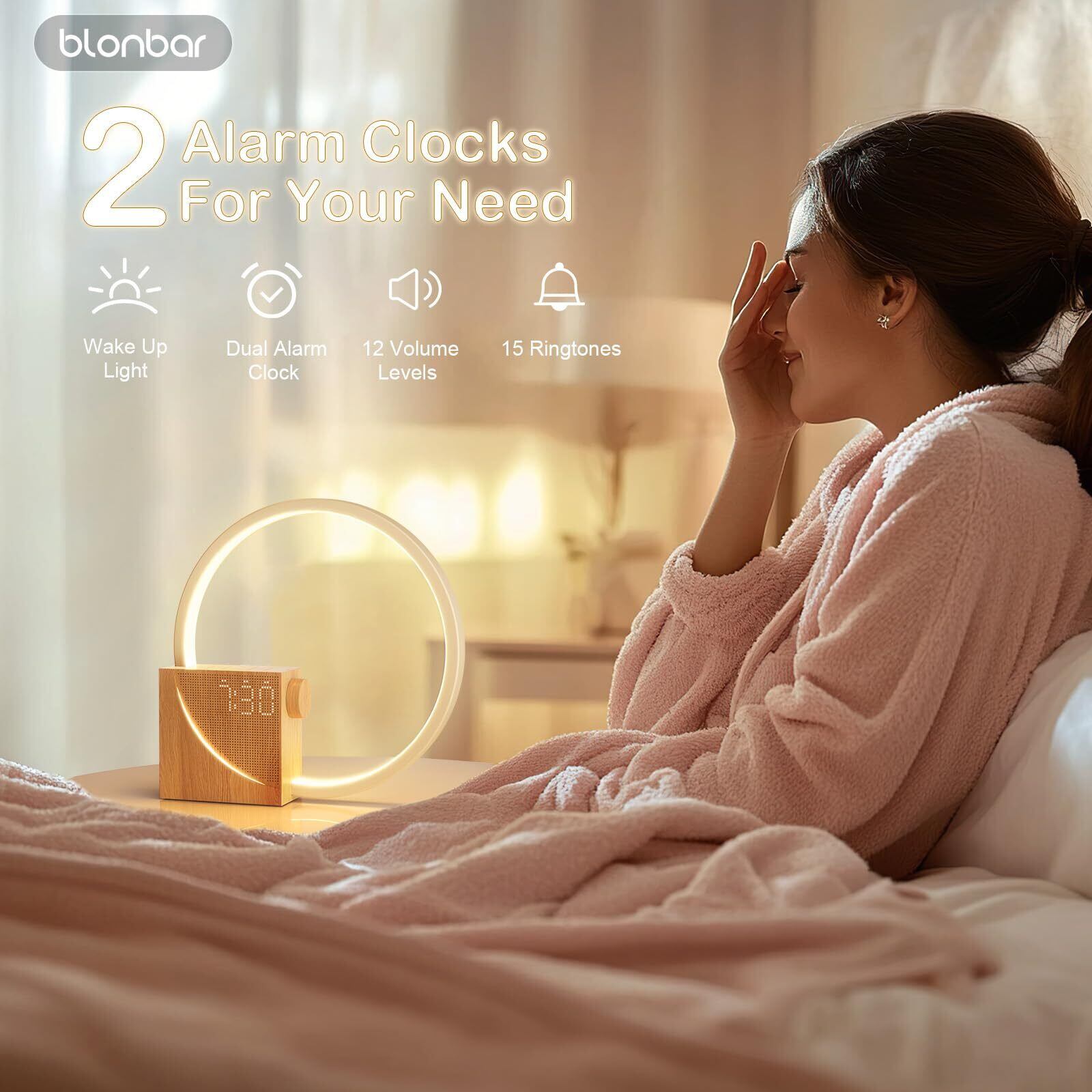 【特価セール】blonbar 間接照明、ベッドサイドランプusb充電 授乳ライト テーブルランプ4段階調光 10種類のホワイトノイズ常夜灯 ダブルアラームセット、ウェイクアップ日の出目覚まし時計 光ライト おしゃれ、ルームランプ10分間の寝ぐせ機能 寝室やリビングに適しています光目覚まし