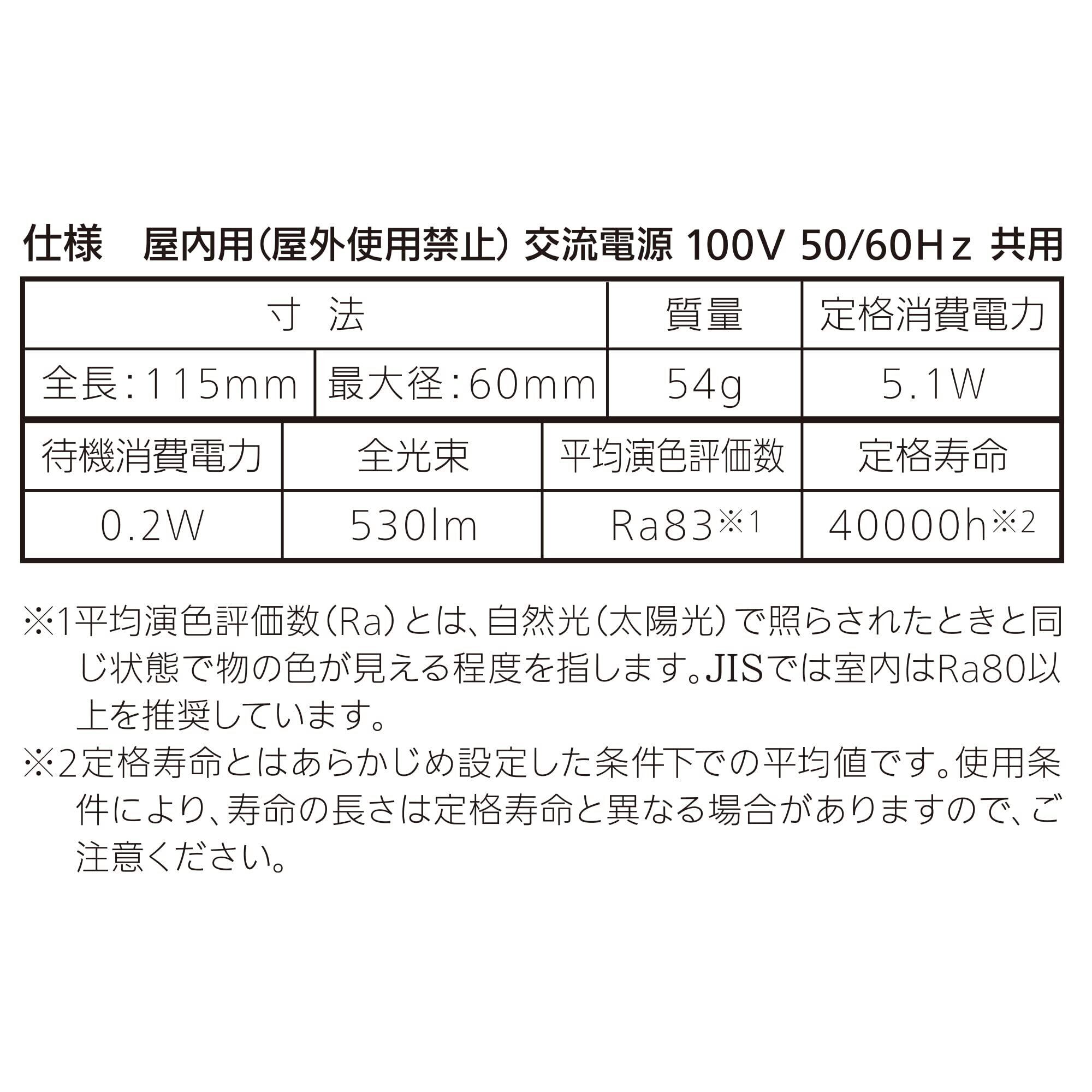【 仕 様 】■ 寸法:全長115mm、最大径60mm■ 質量:54g■ 定格消費電力:5.1W■ 待機消費電力:0.2W■ 全光束:530 lm■ 平均演色評価:Ra83■ 定格寿命:40000h ※屋内用(屋外使用禁止)