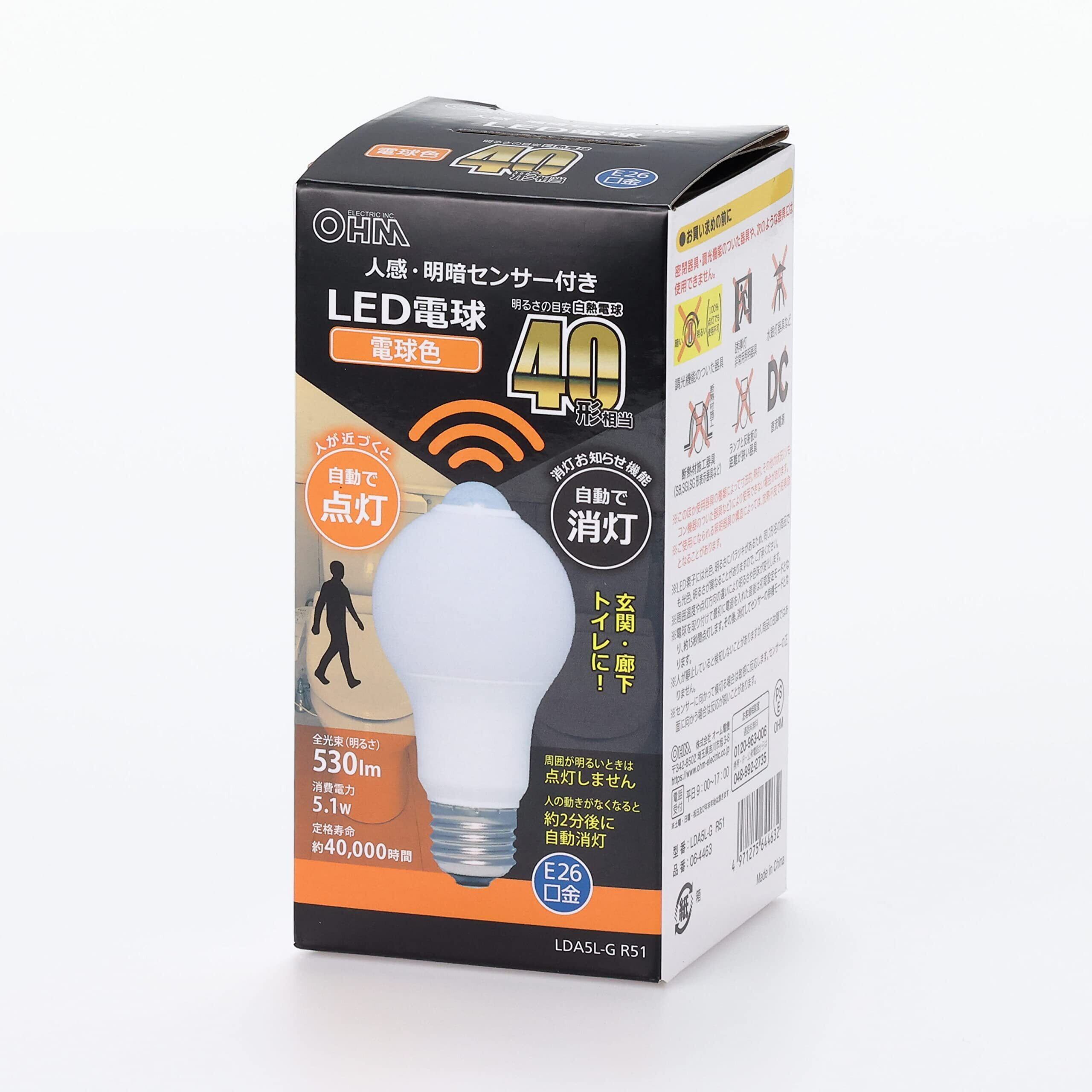 【新着商品】オーム(OHM) 電機 LED電球 E26 40形相当 人感明暗センサー付 電球色 人感センサー 40ワット相当 自動点灯 玄関 トイレ 廊下 階段 LDA5L-G R51 06-4463