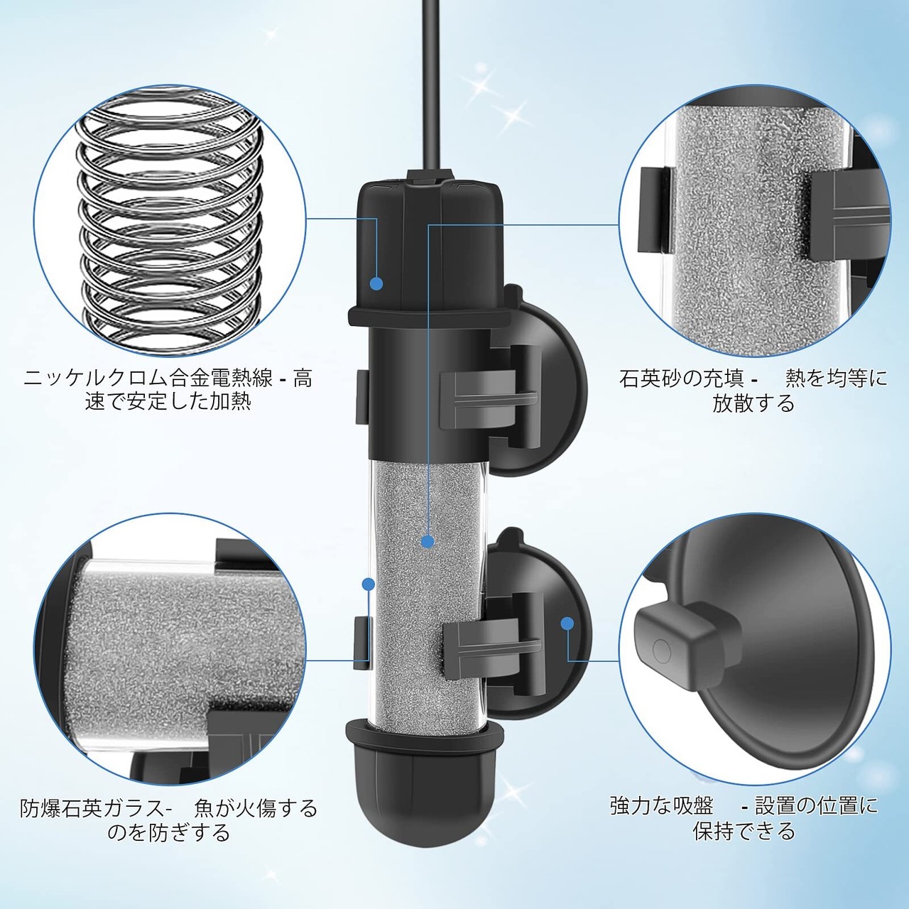 プレミアムクオーツ使用:水槽ヒーターは厚さ2mmのクオーツガラスを使用。この水槽ヒーターは爆発や腐食に強く、魚や他の家畜をパンチや火傷から守ります。