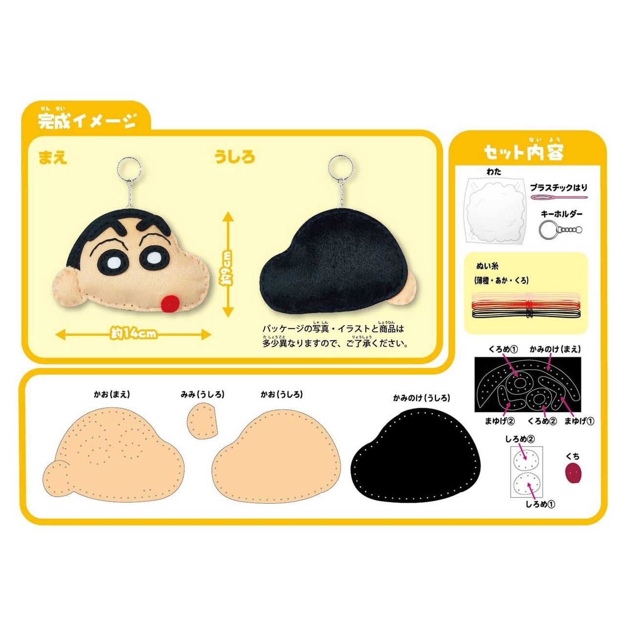 クレヨンしんちゃん の キャラクター マスコット が作れる ソーイング キット ! 付属の プラスチック 針 と 糸 を使って、順番通りに 布 を縫い合わせて最後に 綿 を詰めると マスコット キーホルダー が作れます。
