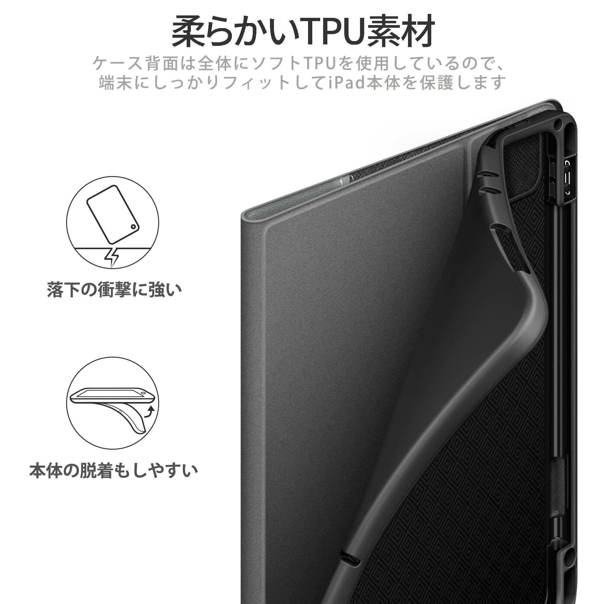 【全面保護・衝撃吸収】高柔軟性があるTPU、耐久性に優れたPUレザーなどの素材採用しており本体を優しく守ります。iPadケースとカメラやディスプレイに高低差があり、高いところから落とした場合でもiPadへの衝撃を吸収し、液晶画面が割れないよう設計されています。