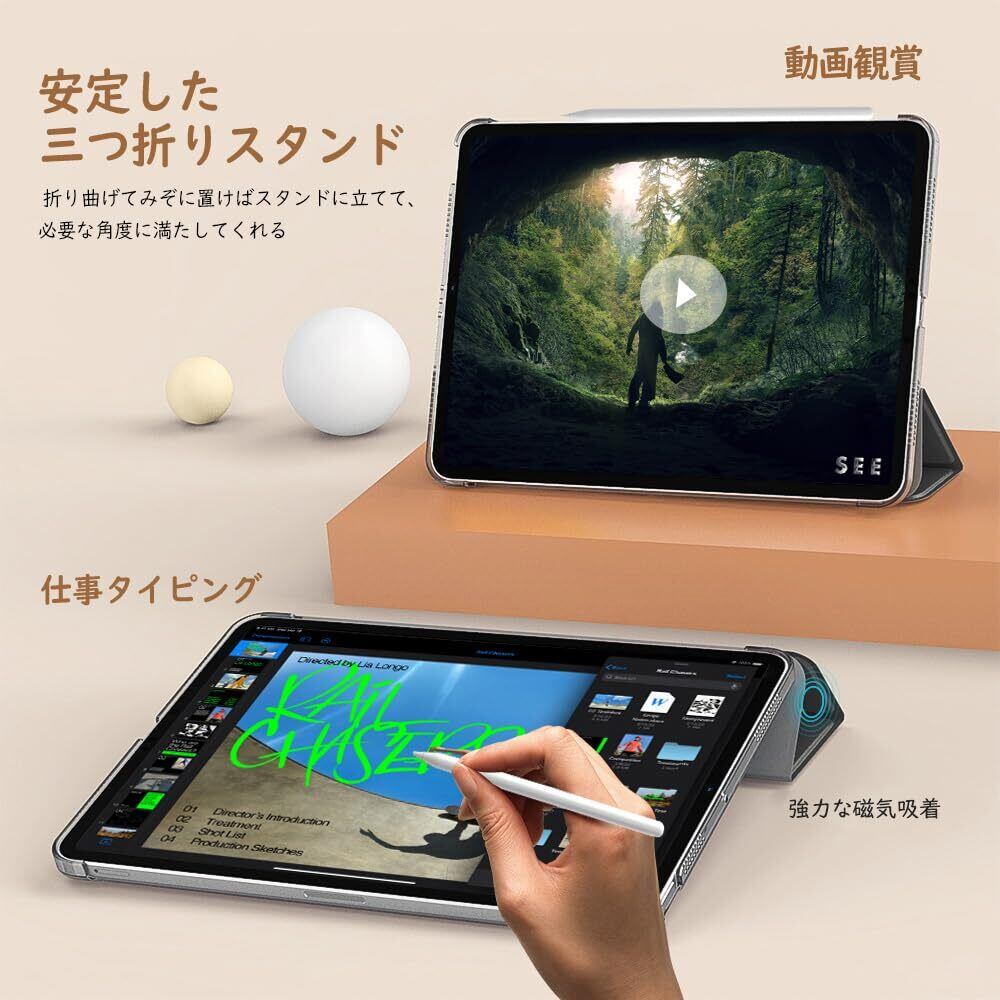 TiMOVO iPad Air 11インチ ケース M3/M2 第7/6世代 (2025/2024) iPad air 第5/4世代 ケース 10.9インチ iPadAir7/6/5/4 カバー 11インチ/10.9インチ PencilPro/第2世代ワイヤレス充電対応 PUレーザー 三つ折り オートスリープ機能 落下防止 手帳型 半透明 ダークグレー