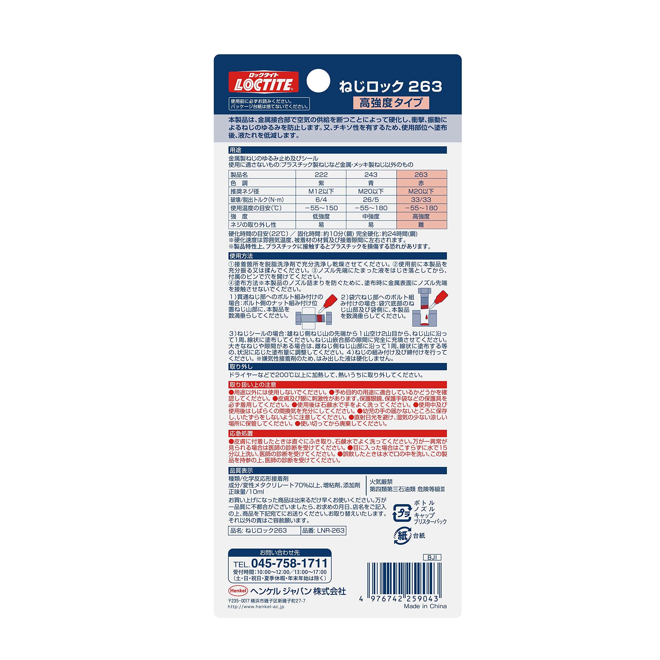 パッケージ内容:LOCTITE(ロックタイト) ねじロック 263 高強度タイプ 10ml - 金属製のねじのゆるみ止め及びシール、取り外しを必要としないナット・ボルトの固定