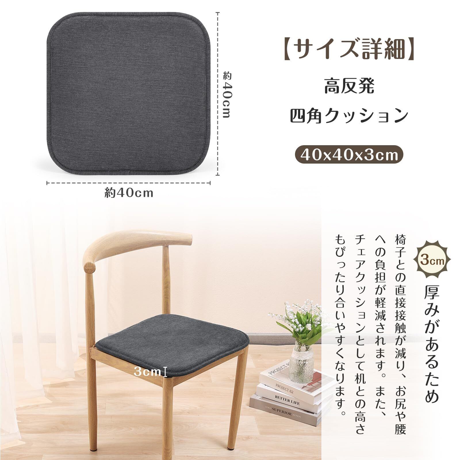 【スクエア座布団のサイズ】幅40×奥行40cm×厚み3cm、ダイニングチェアだけでなくオフィスチェアにピッタリサイズ。 重さ:約230g/枚。材質: 表地は100% ポリエステル生地、中身は3CMの高反発ウレタン、裏面に滑り止め加工。