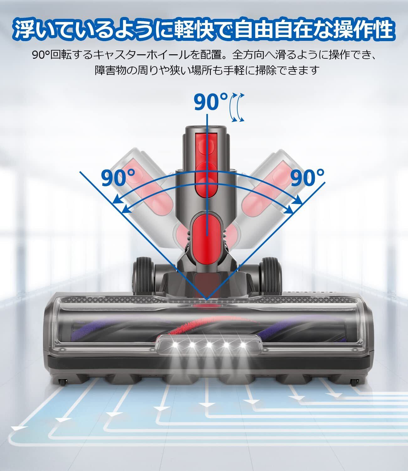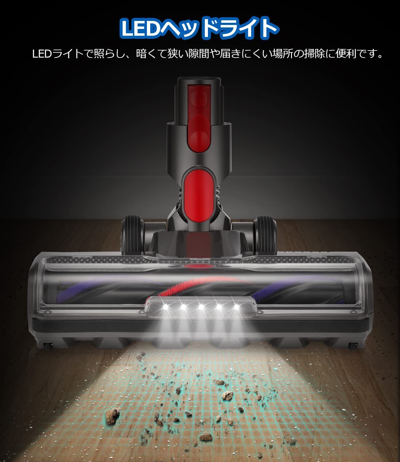 【最新強化版】クリーナーヘッド専用モーターをローラーに内蔵することで、毎分最大155,000回転し、パワフルな吸引力を生み出します。LEDヘッドライト5枚は、LEDライトで照らし、暗くて狭い場所や届きにくい場所も確認しながら掃除で、隠れたホコリを見逃しません。ナイロンフェルトで覆われた全幅サイズのローラーを搭載。従来のクリーナーヘッドを根底から見直し、革新的なクリーナーヘッドを開発しました。