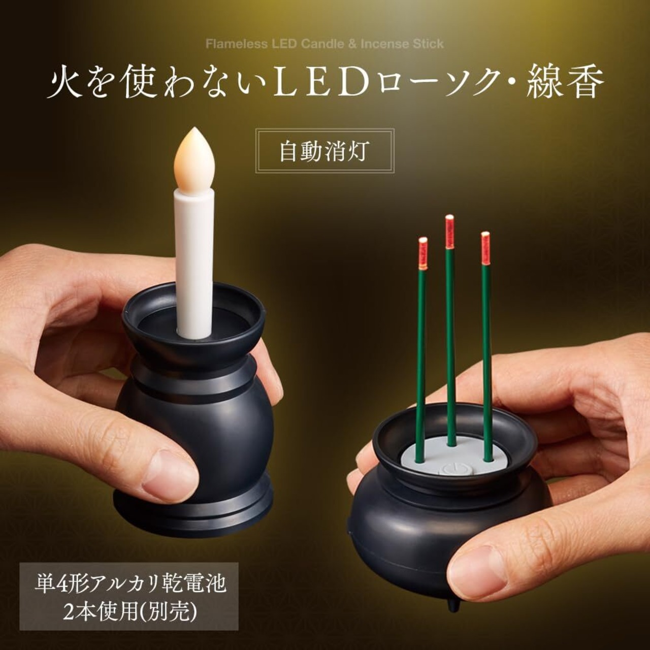 【LED線香】商品サイズ/(約)6.2×6×高さ10.8cm(線香取り付け時)、電源/単4形アルカリ乾電池 2本使用(別売)、光源/LED、材質/ABS樹脂・ステンレス・アクリル樹脂、(約)12時間:1日1回(10分後自動消灯)の使用で約2.5ヵ月使用できます。(単4形アルカリ乾電池 2本使用)※自社での測定結果です。電池の種類・残量・使用状況などで点灯時間は異なります。