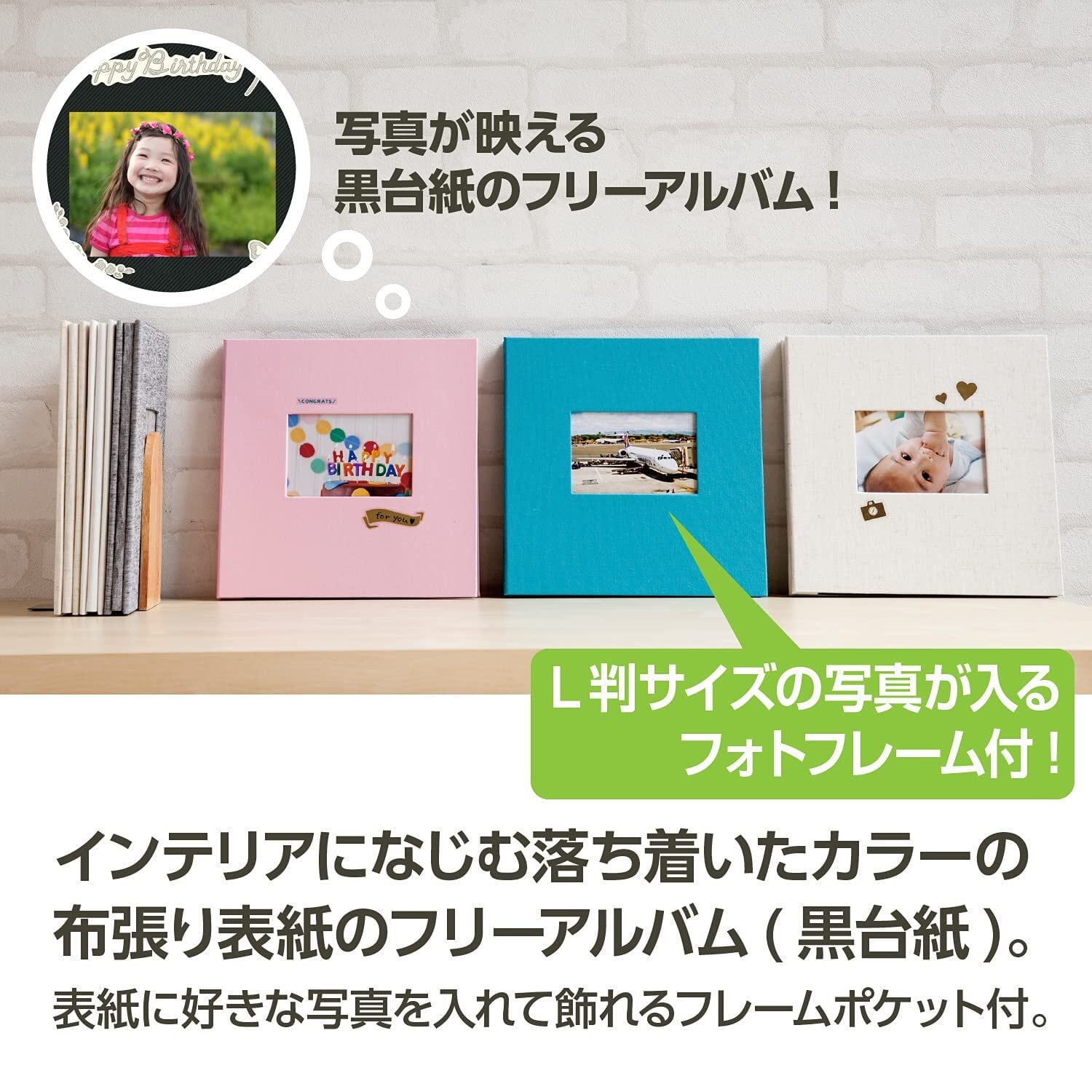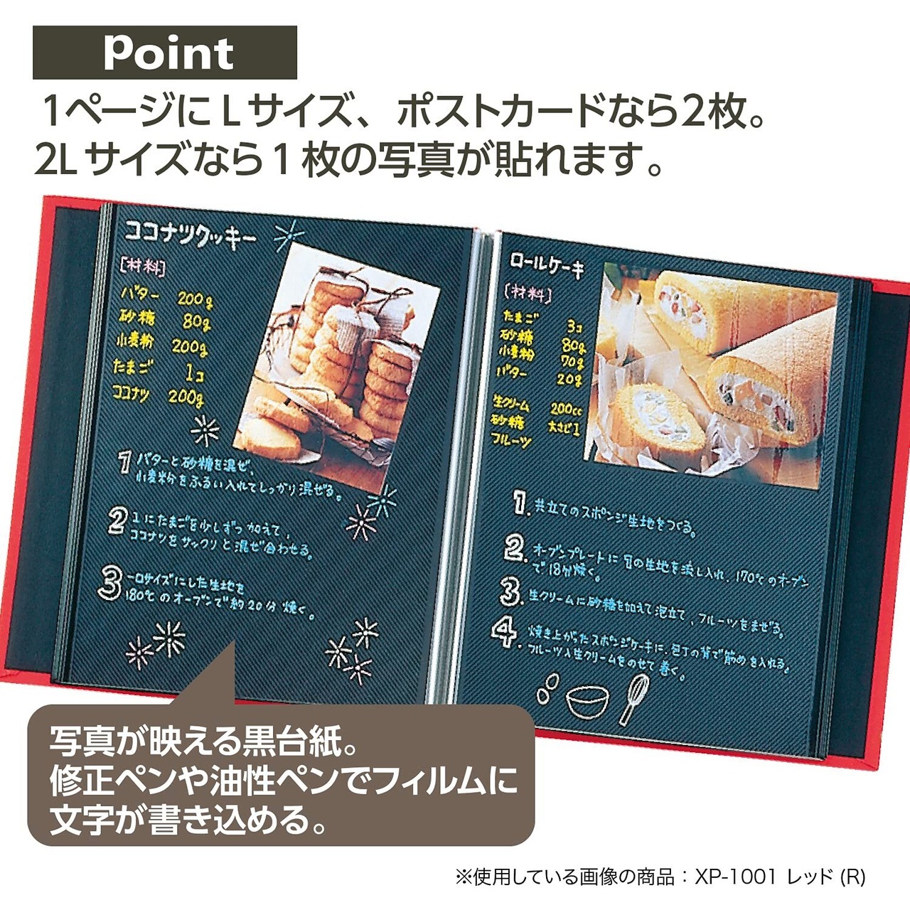 1ページにLサイズ、ポストカード、ハイビジョンなら2枚、2Lサイズなら1枚の写真が貼れます