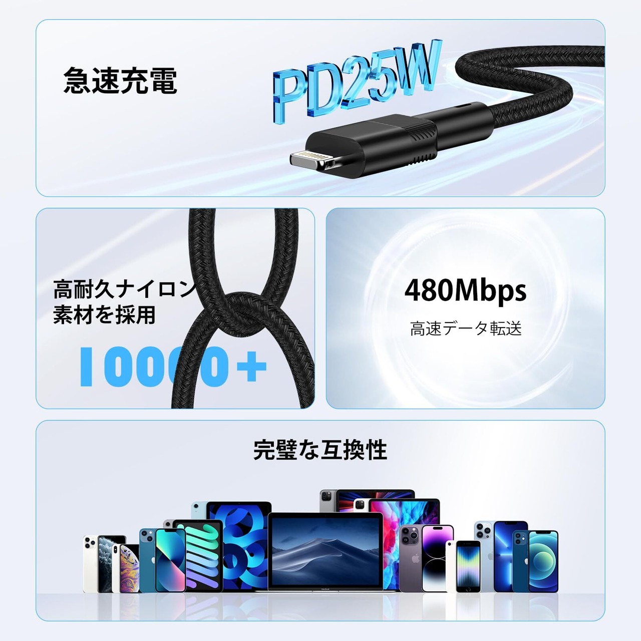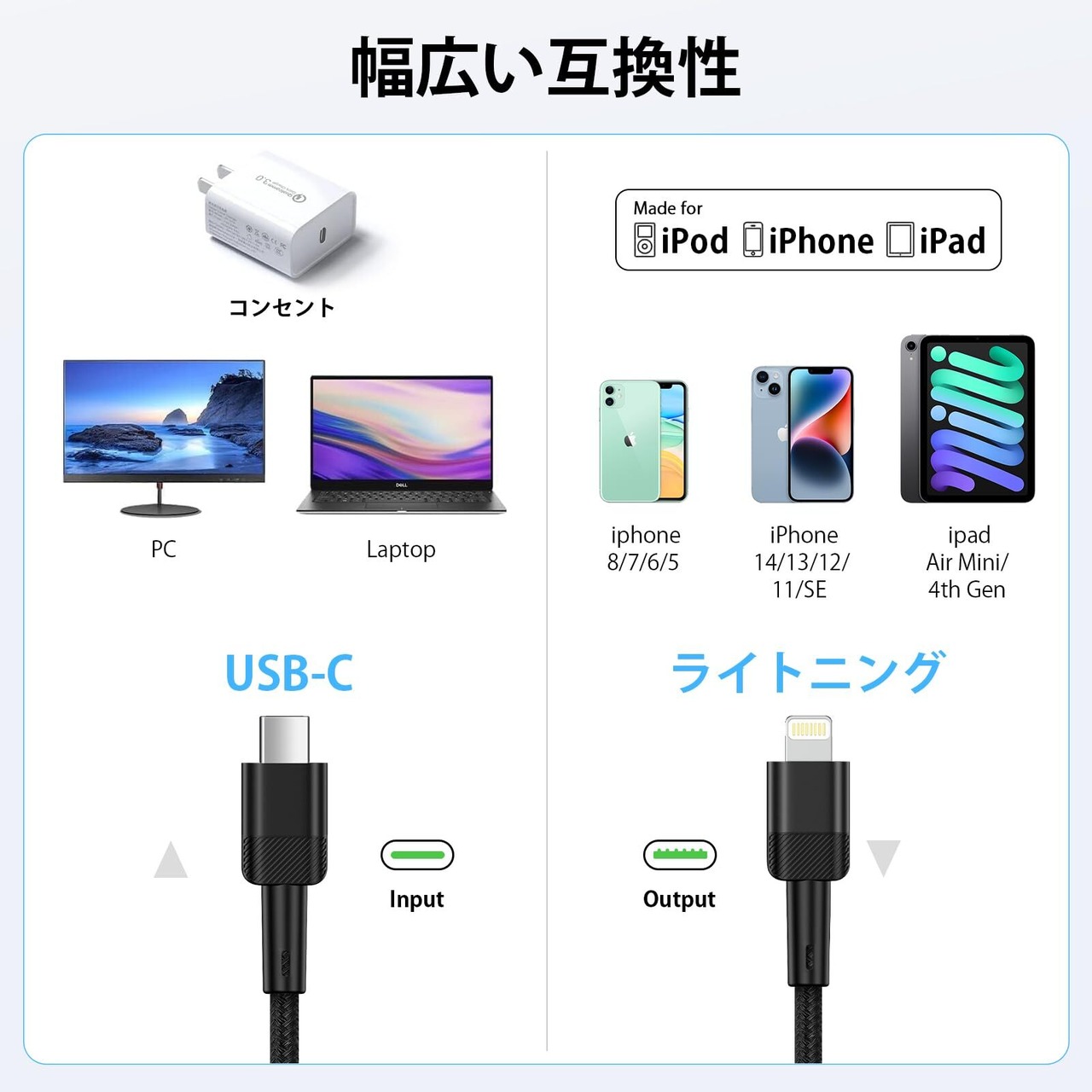 【高互換性】すべてのiPhoneデバイスの高速充電とデータ転送をサポートします。iPhone 14/ 14 Pro /14 Pro Max /iPhone 13/ 13 Pro/ 13 ProMax / 13 Mini / iPhone 12 / 12 Pro Max / 11/11 Pro Max / XS / XS Max / XR / X / 8 Plus / 8/7 Plus / 7 / 6s Plus / 6s / 6 Plus / 6 / 5sとの互換性/ 5c / 5 / iPad Air / Air 2 / Air 3 / mini / iPad 4th gen / iPod Touch 5th gen / iPod touch 6 / iPod nano 7th gen などに対応。