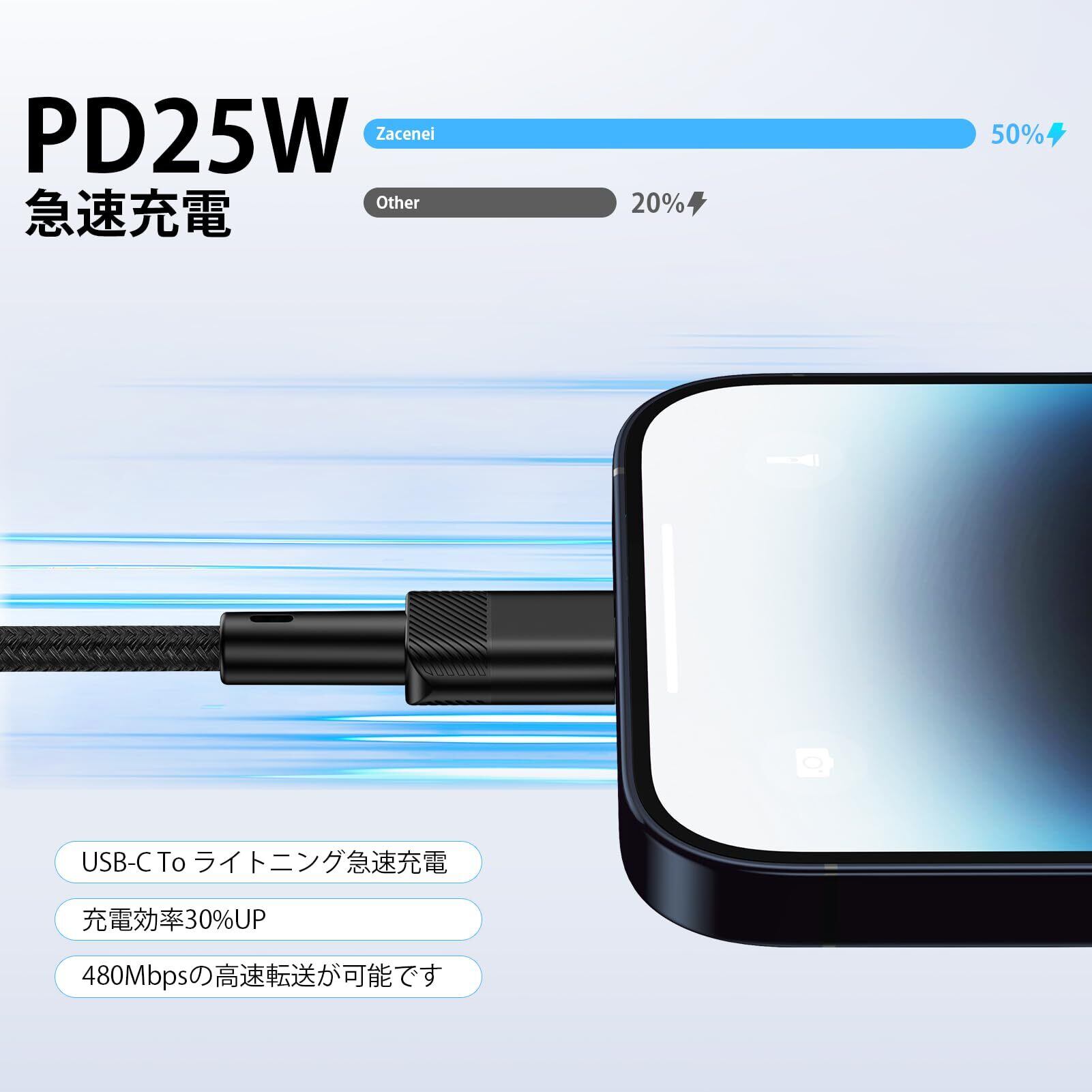 【PD急速充電&データ同期】0.3m Lightning to USB-C 充電ケーブルは25Wの急速充電と最大480Mbpsの高速同期を実現出来ます。充電ケーブルは高品質の銅線を使用し、効率的な充電を実現し、安全な充電実験を提供します。大口径ワイヤーがコード抵抗を低減し、充電スピードをアップ、最大25Wで急速充電可能、充電速度が30%UP!