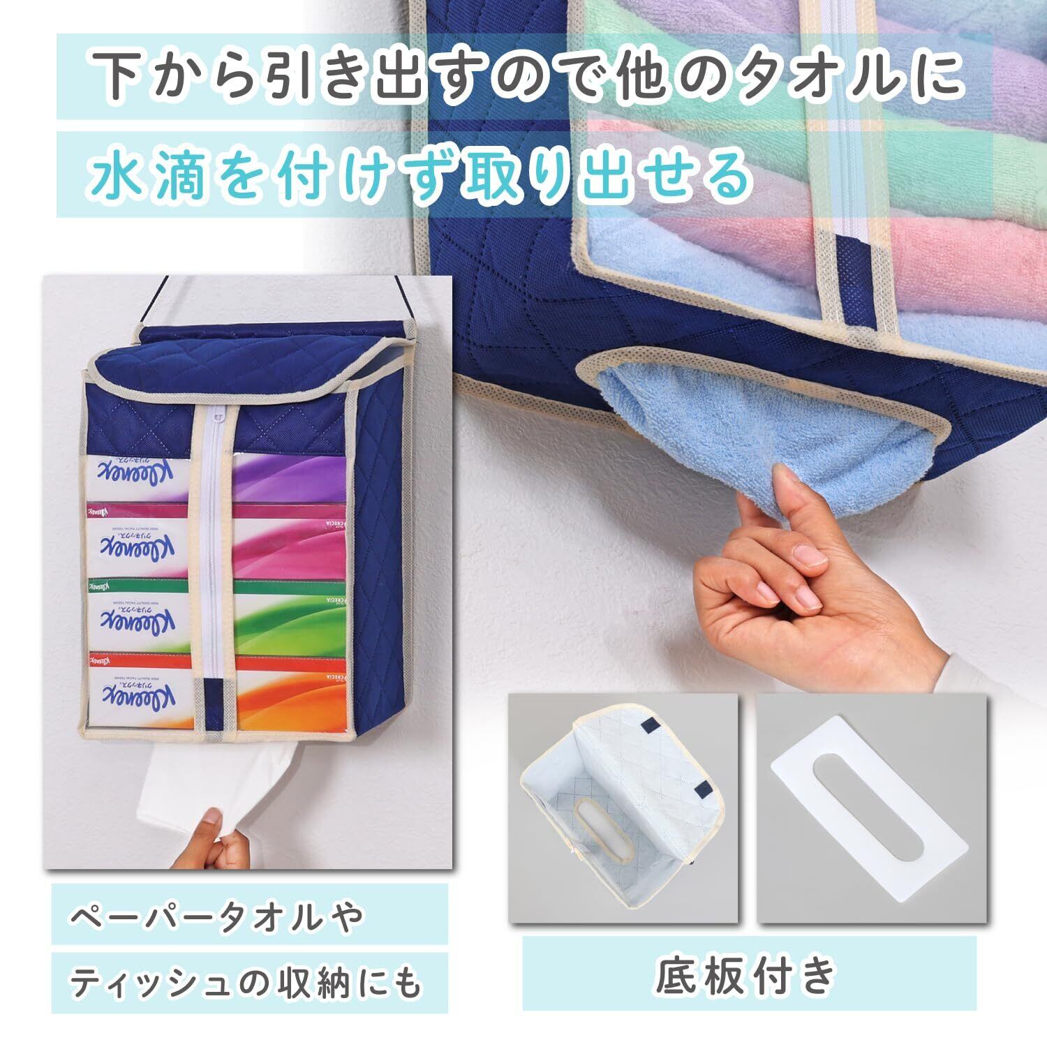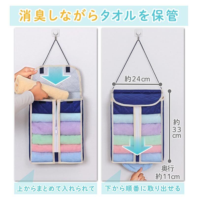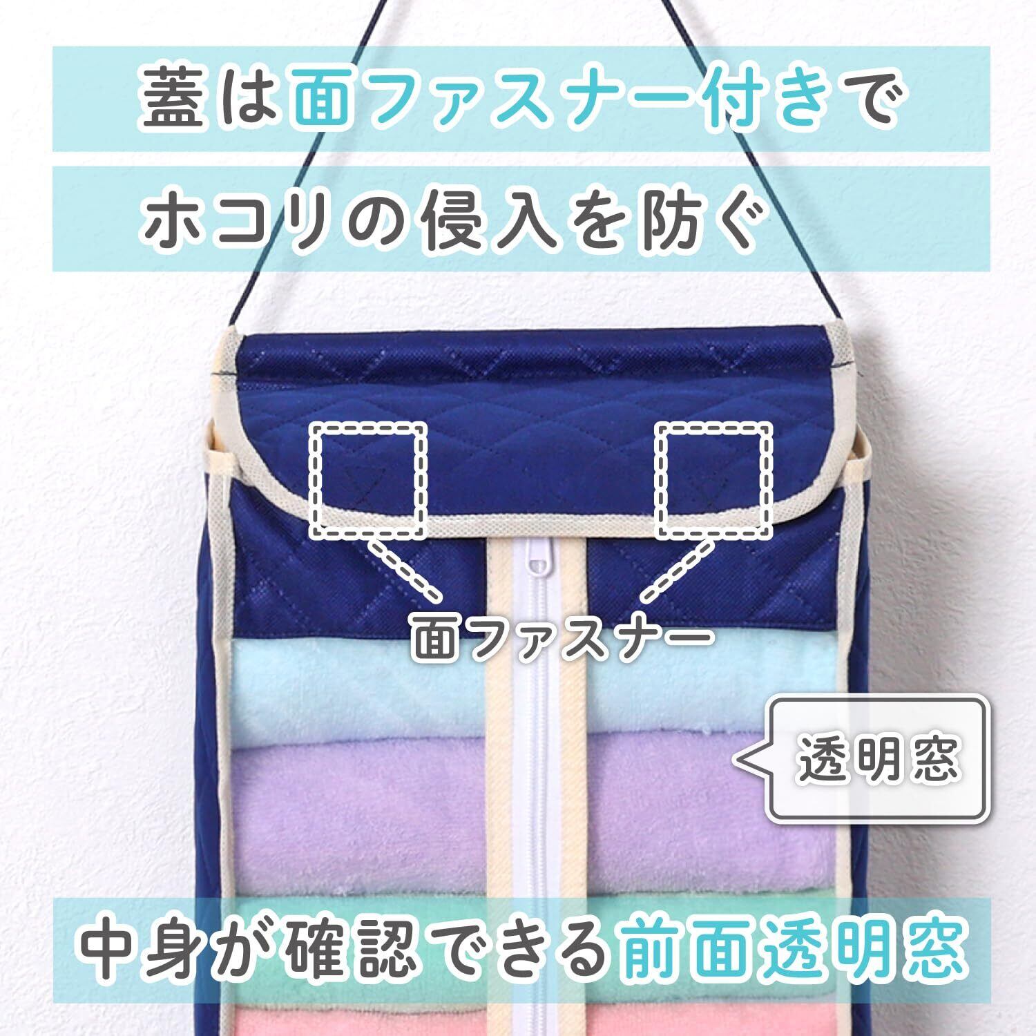 ●通気性のよい不織布で、ホコリや汚れからタオルをしっかりガード。壁掛け式のタオル収納。