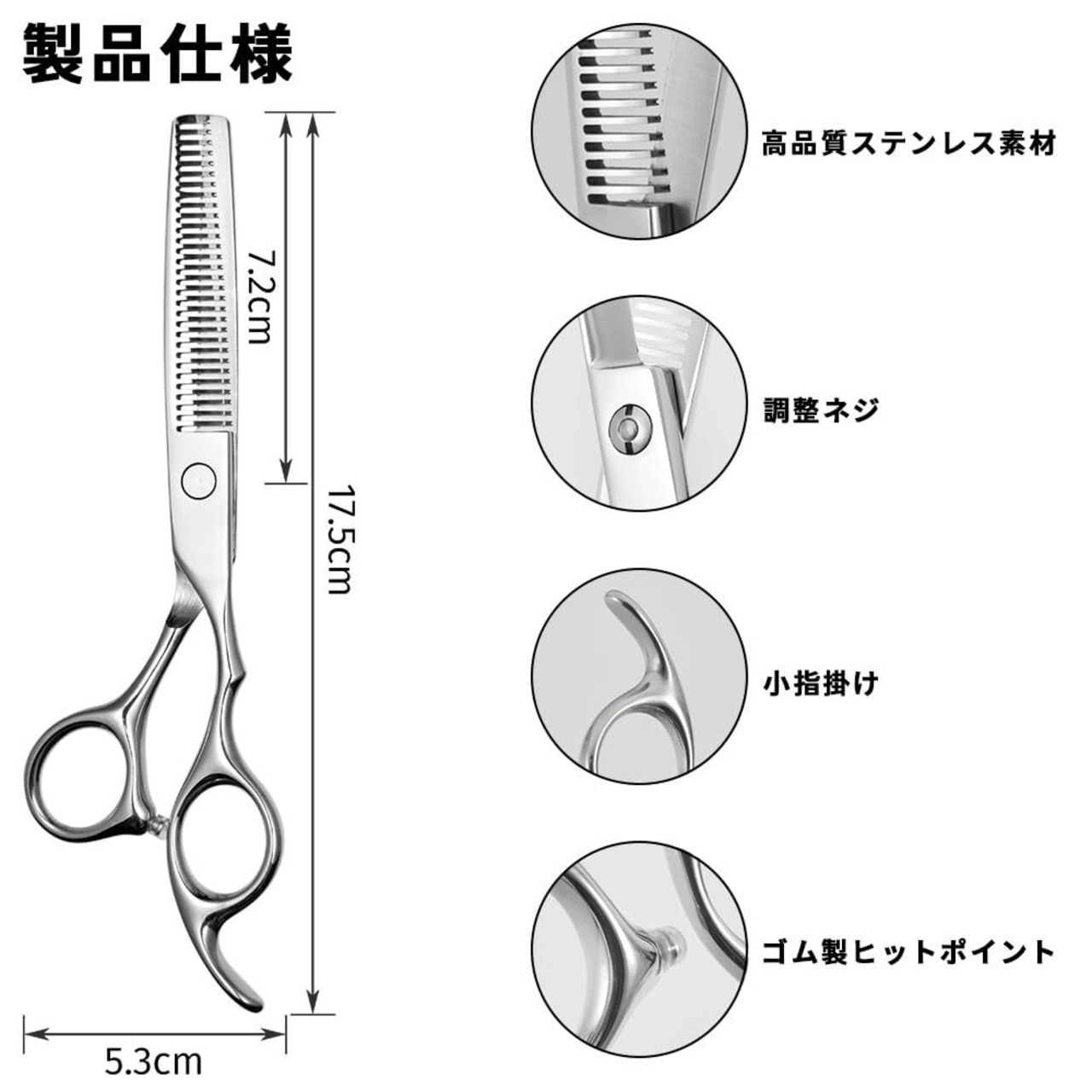 【商品詳細】スキばさみ(すき率20%) 材質: 高硬度ステンレス 製 (全長17cm : 刃長7cm) 刃の駆動部分にさび止めの油が付着している場合がございます.
