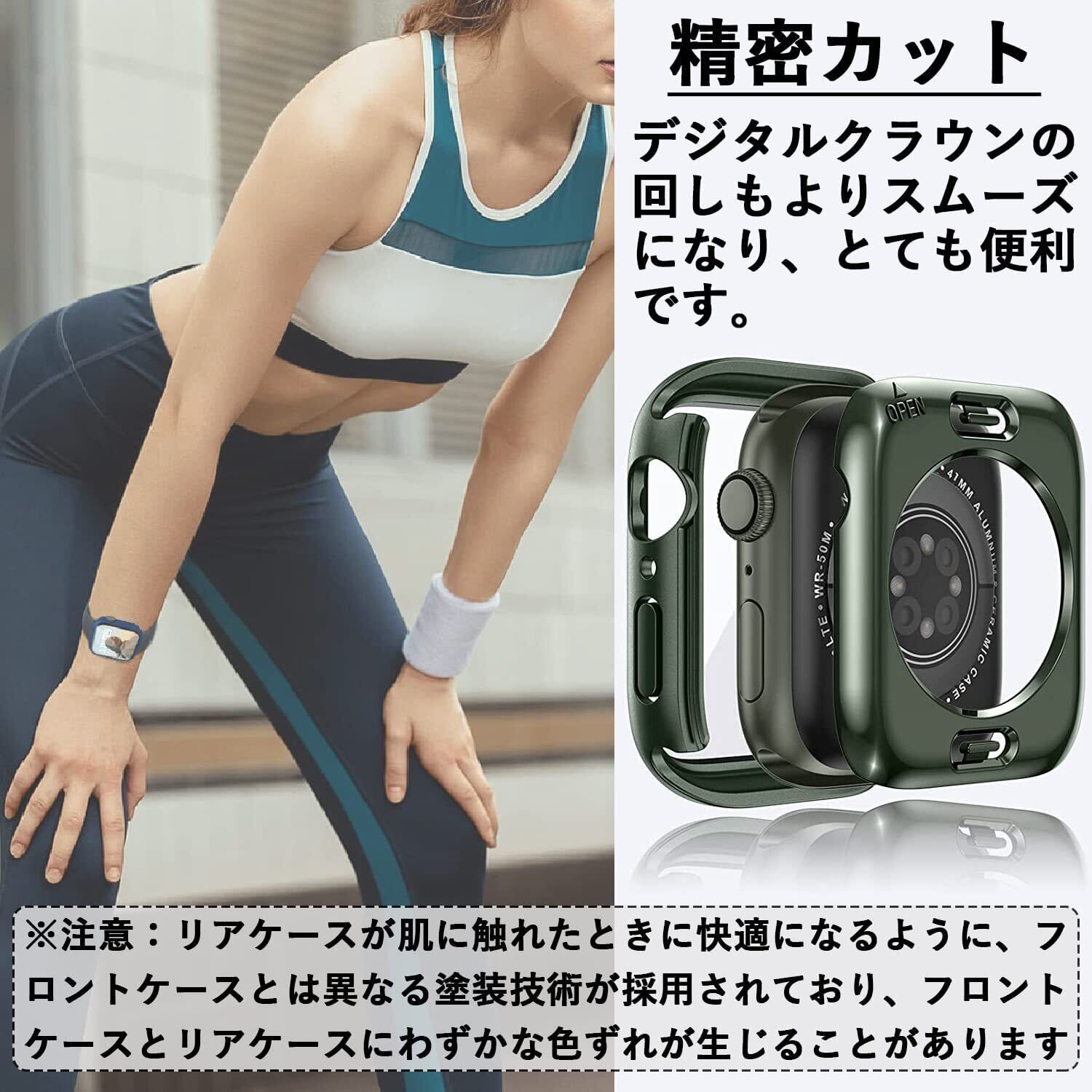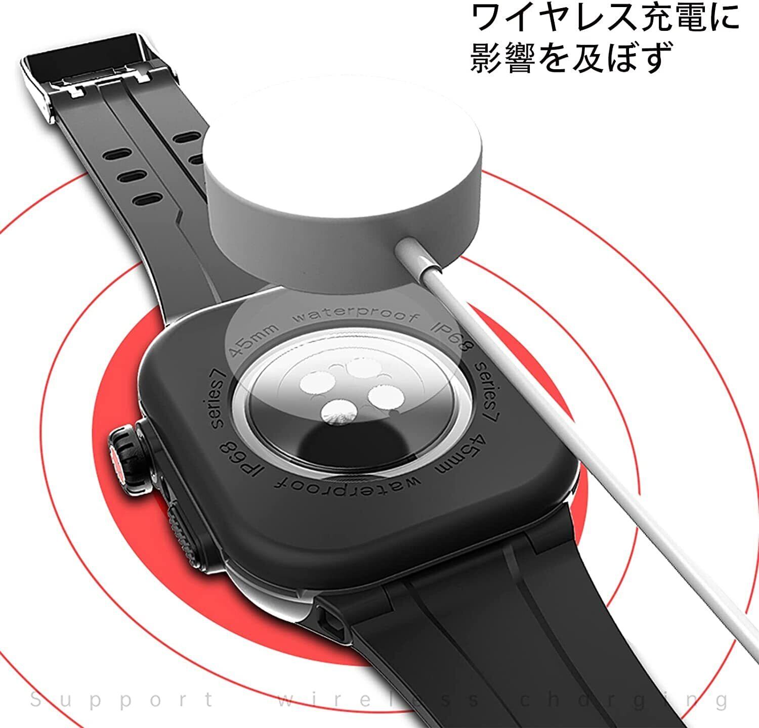 【究極の一体感】3 in 1一体型カバー(背面カバー+ガラスフイルム+側面カバー)。アップルウォッチを基に、精確に設計されておりぴったりとアップルウォッチと密着しボタンまで守り、抜群の一体感です。そして、バンド部分との干渉もなく、保護ケースを装着したまま充電出来とても便利です。