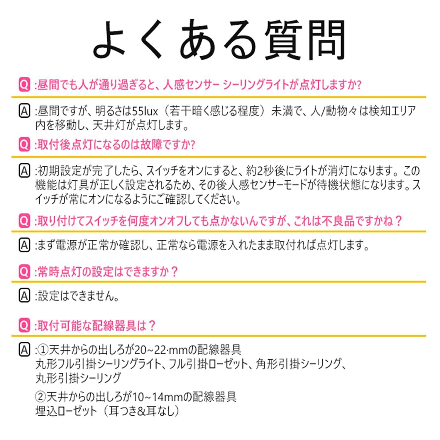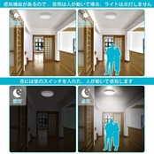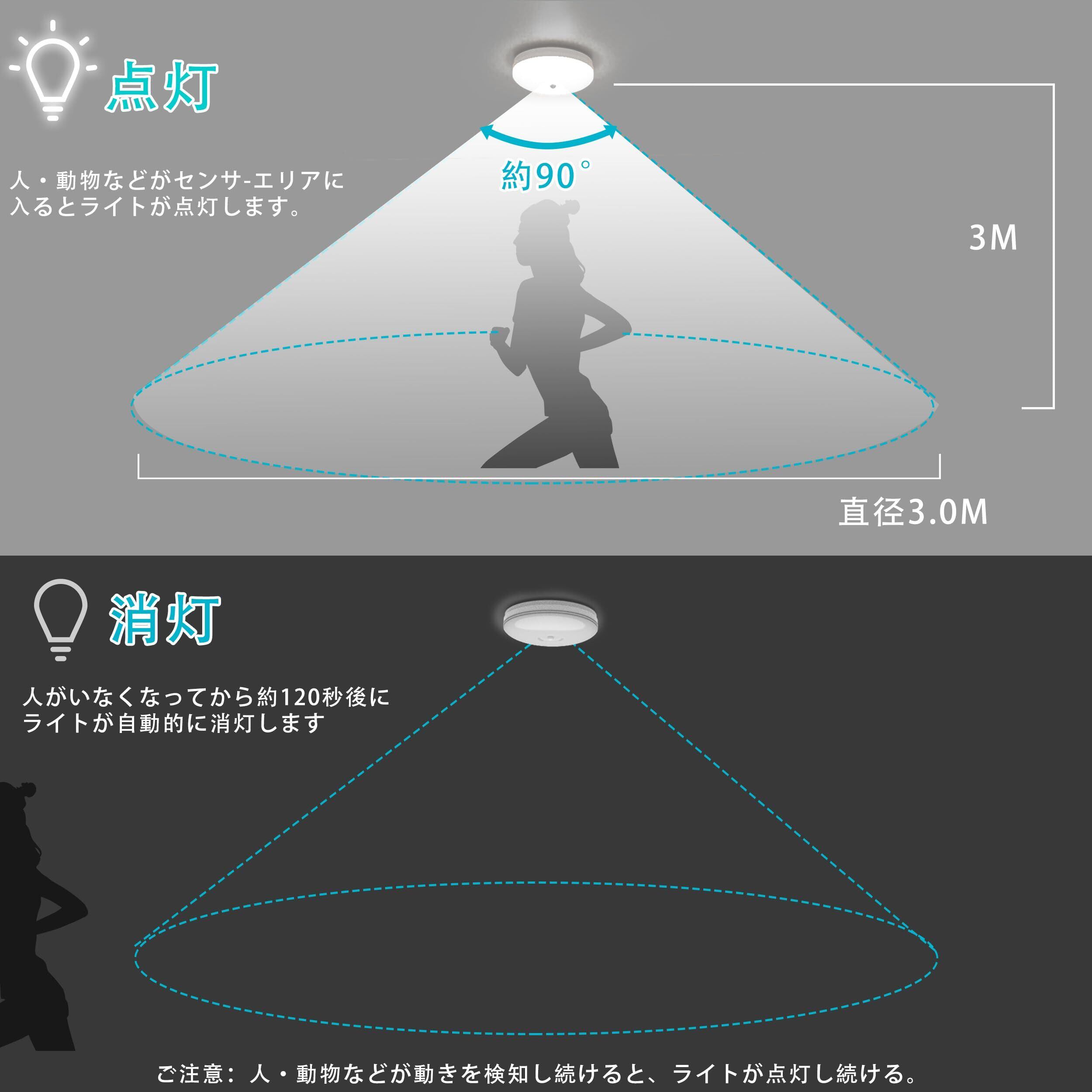 人感センサーライトの検知距離は約3M。感知機能があり 、昼間は人が動いて場合、ライトは点灯しません。夜には壁のスイッチを入れた、人が動いて感知します。 人がいなくなってから120秒後にライトが自動的に消えます。【ご注意:初期設定が完了したら、スイッチをオンにすると、約2秒後にライトが消灯になります。 この機能は灯具が正しく設定されるため、その後人感センサーモードが待機状態になります。スイッチが常にオンになるようにご確認してください。】