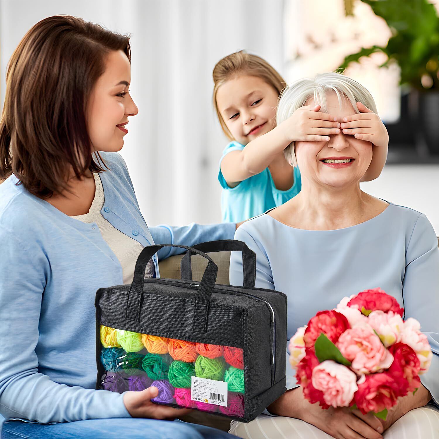 収納バッグ1つ:片面が透明(PVC)の収納編みトートバッグ、防水で軽量、かぎ針編み糸や編み物道具を小さく仕上げた作品を入れるのに十分なスペース。 お子様やクラフトメーカーへの素晴らしい贈り物です。