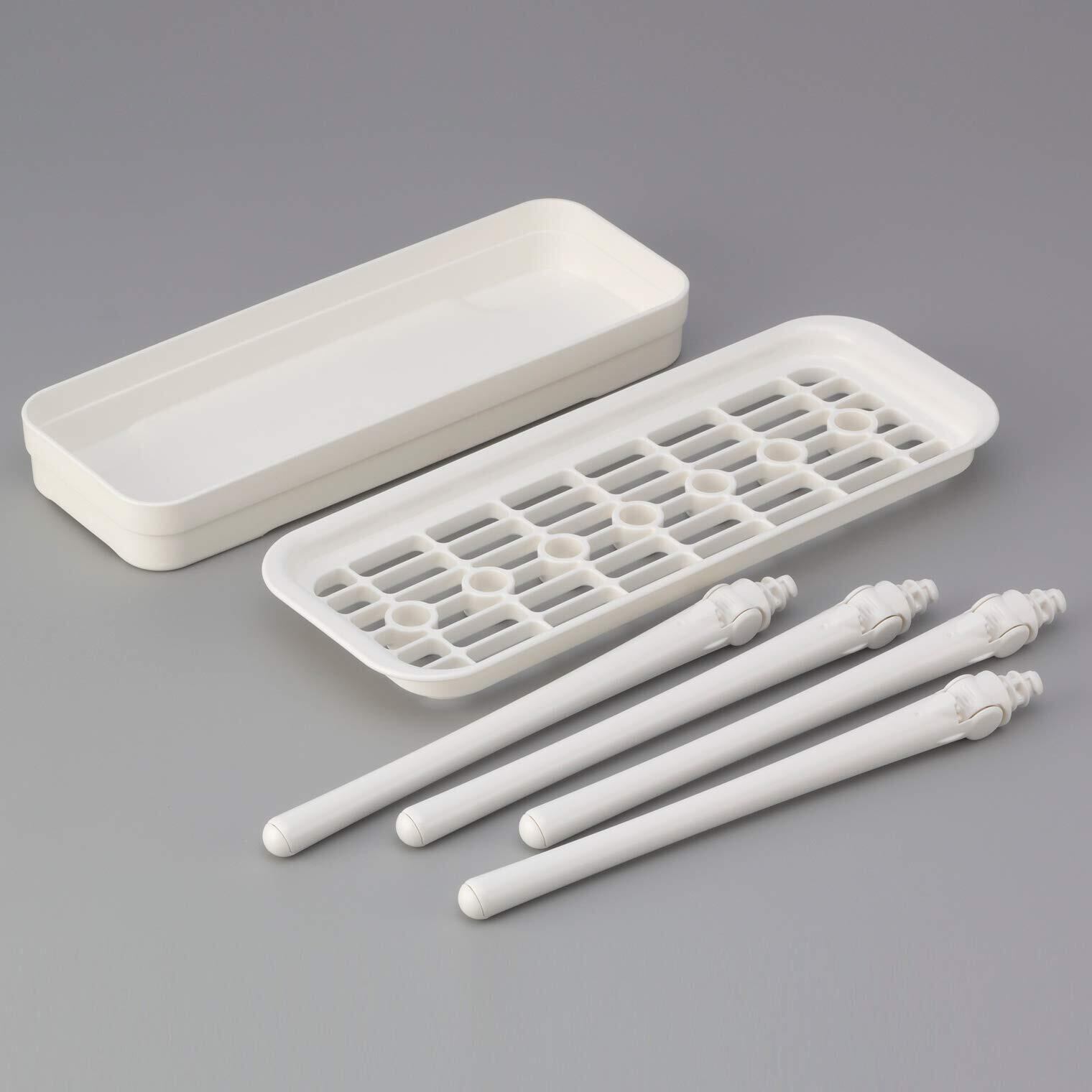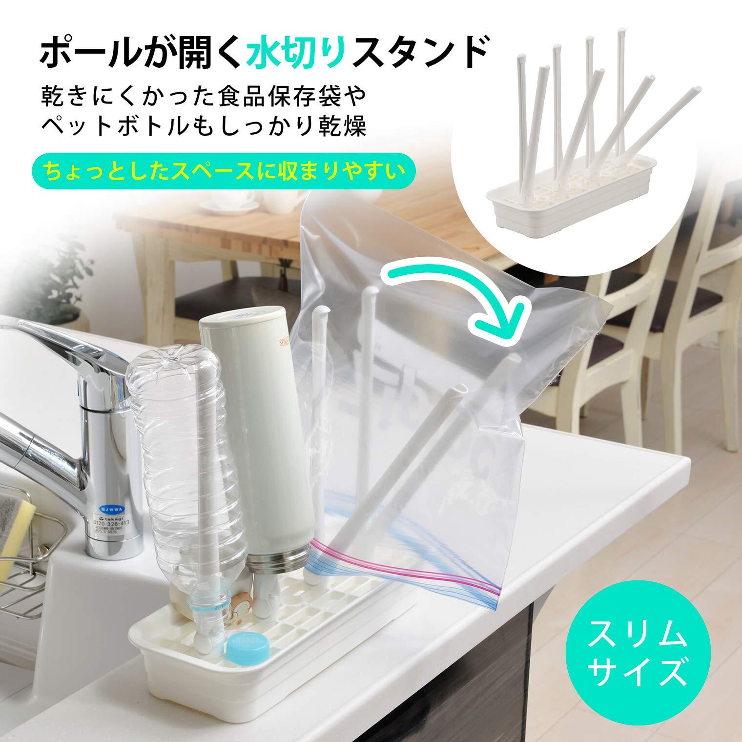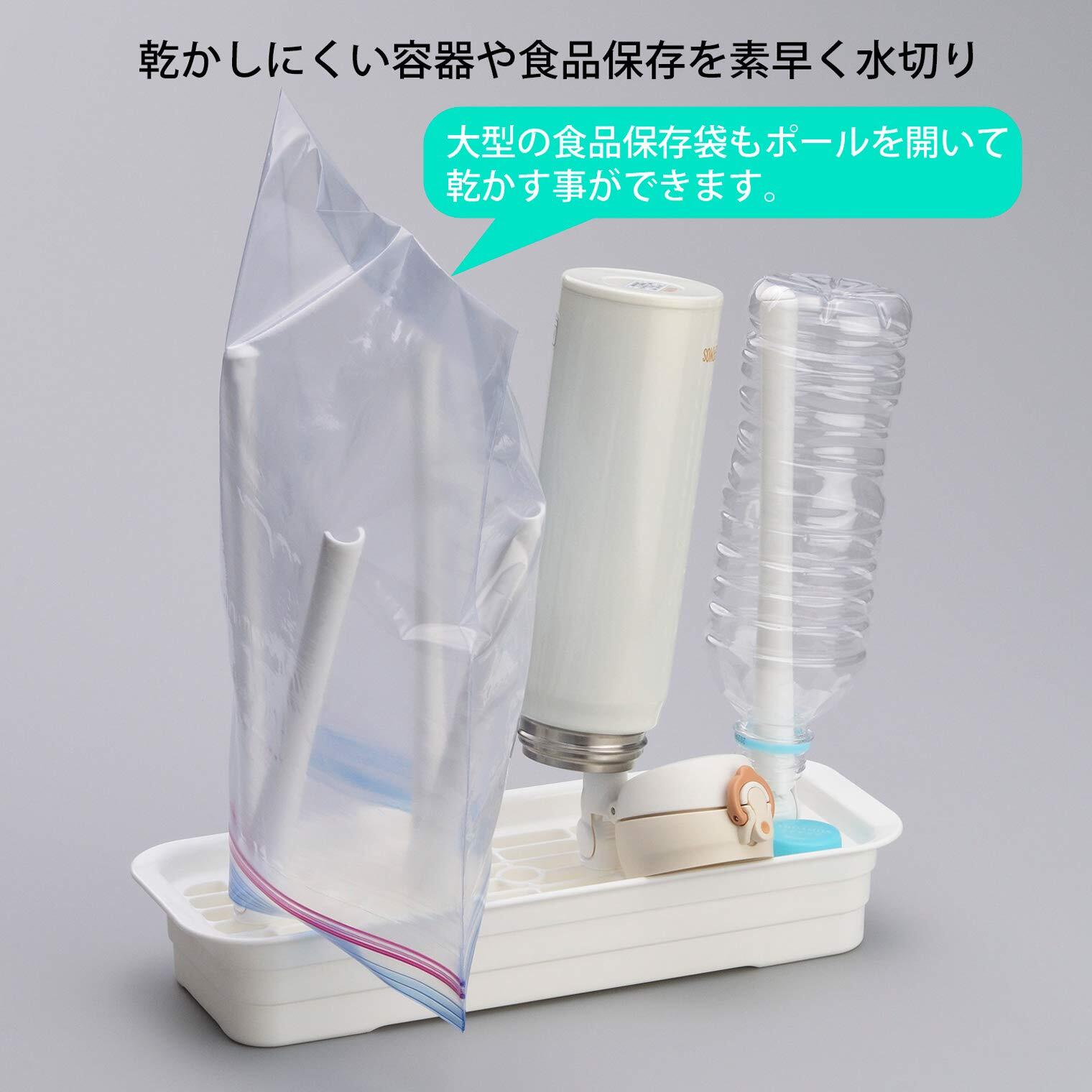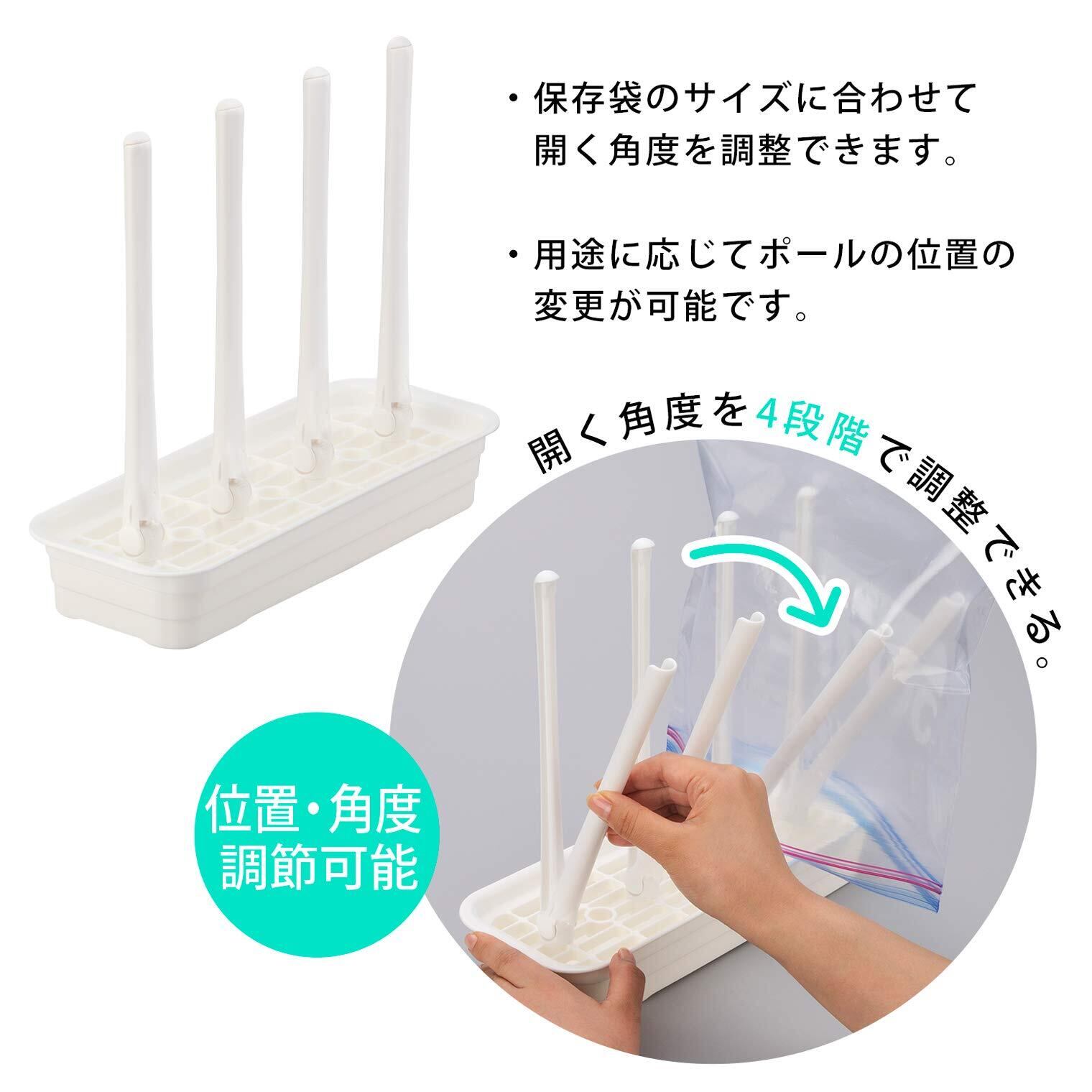 ●コンパクトサイズのボトル・袋水切りスタンド。●"開く"ポールで乾きにくかった食品保存袋の中もしっかり乾燥。●ポールは4段階に角度調整OK!