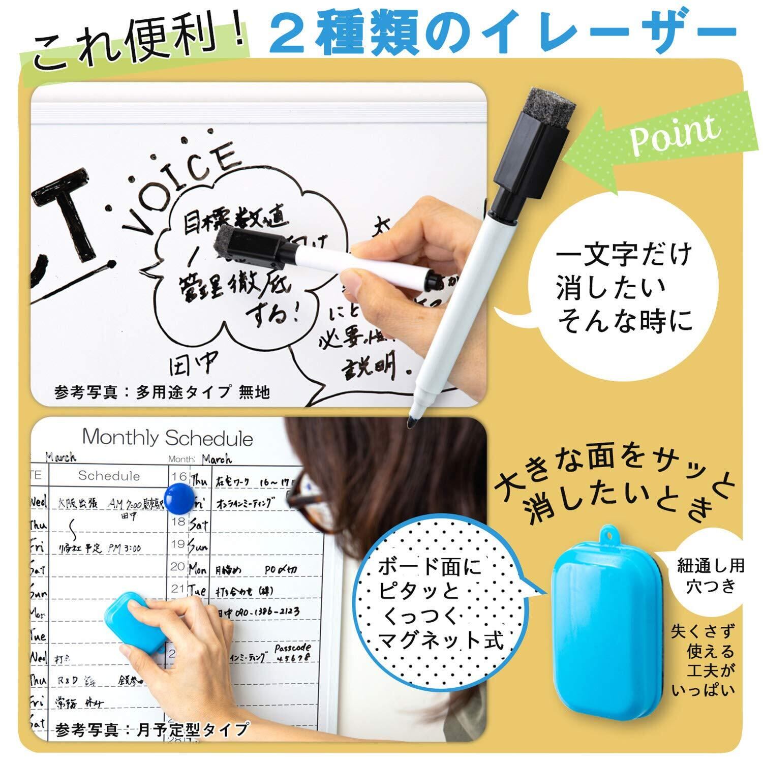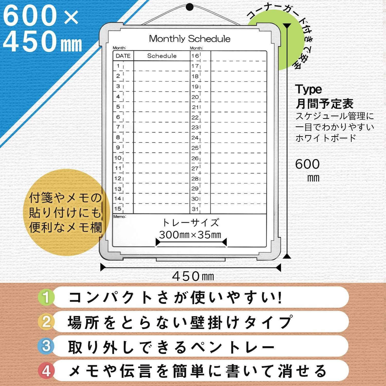 軽くて扱いやすい「幅450mm×高さ600mmサイズ」。スケジュール管理に便利なタテ型月間予定表タイプの樹脂枠ホワイトボード。