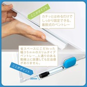 吊り下げヒモ装着済みで、場所を取らず使える壁掛タイプ。