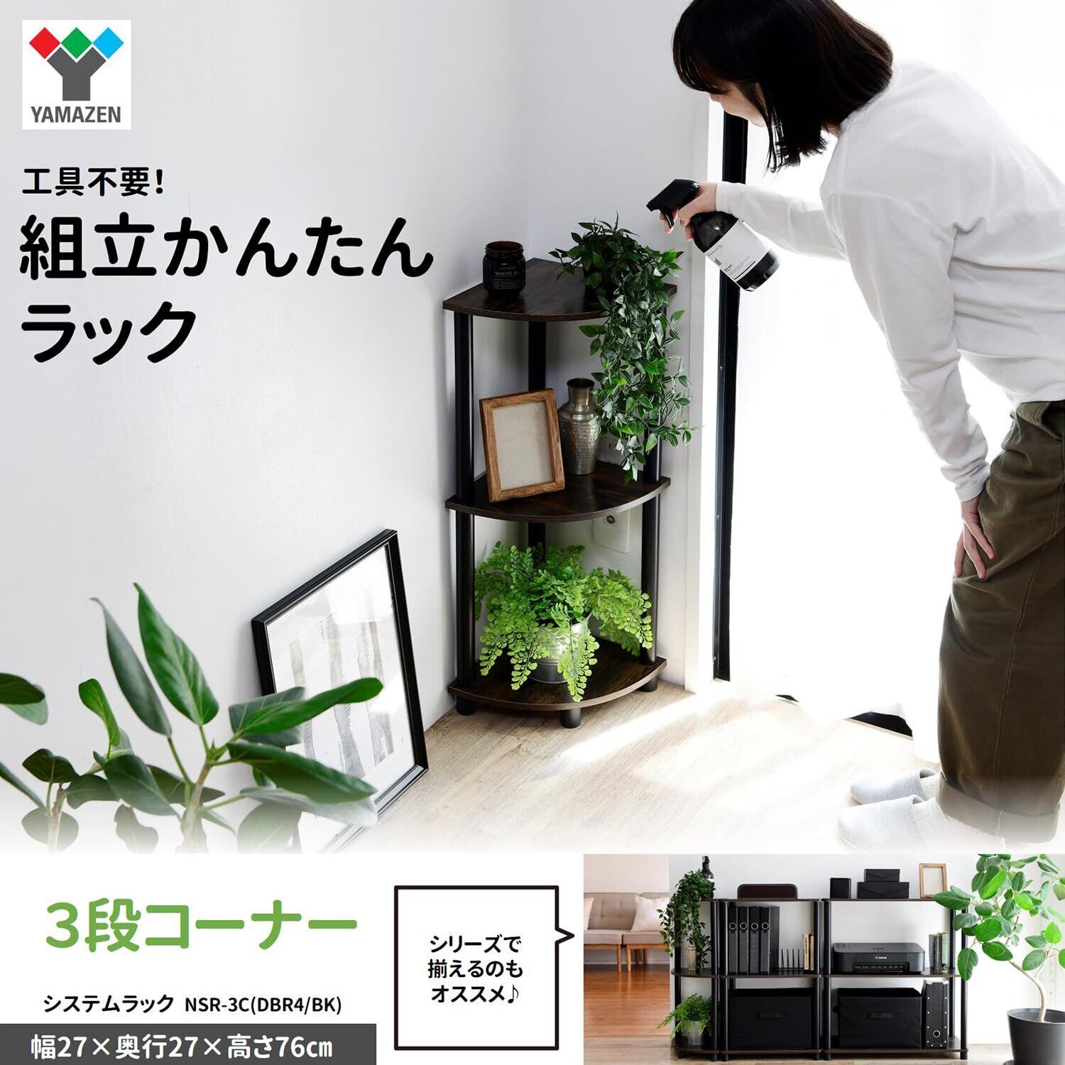 【新春セール】山善(YAMAZEN) ラック 棚 (スリム) A4対応 【組立かんたん】 3段コーナー 幅27×奥行27×高さ76cm ダークブラウン NSR-3C(DBR4/BK) 1人暮らし