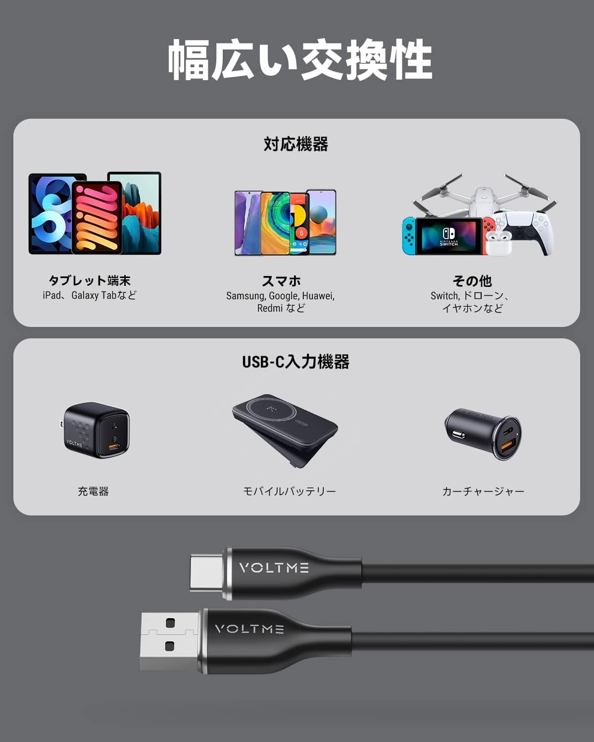 【安心保 証対 応】VOLTME USB-A to USB-C ケーブル、24ヶ月保 証( (※注 文番号が保 証書の代わりとなります)。