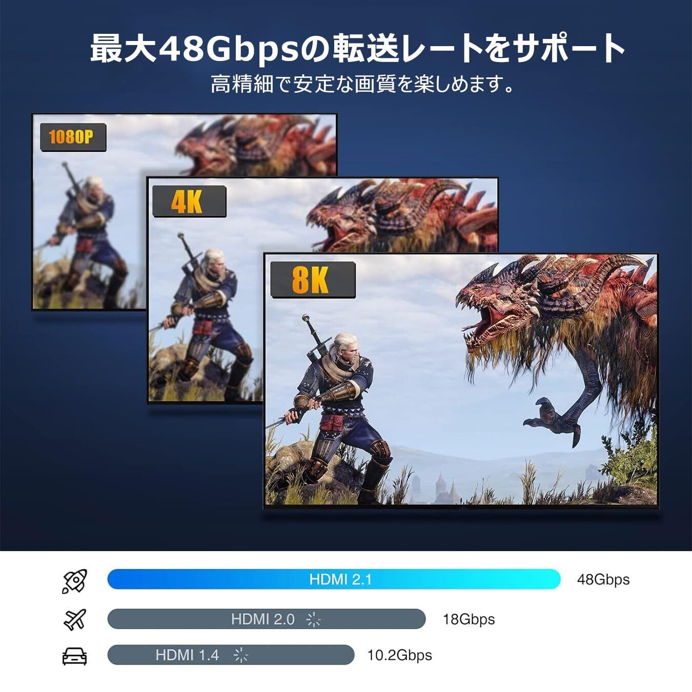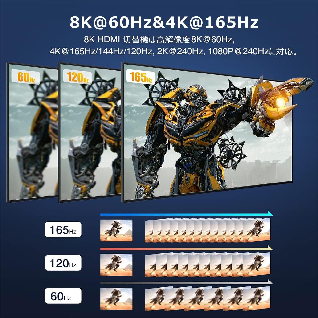 【8K@60Hz 高解像度・高精細な画質】このHDMI セレクターは最新のHDCP2.3チップを搭載し、最大48Gbpsの転送レートおよびすべてのHDMI標準との下位互換性を提供しますので、8K@60Hz、4K@120Hz及び下位の解像度で映像出力をサポートします。また、ドルビー、HDR10、eARC、HDCP 2.2&2.3、dts-hd Master Audio、DTS:Xなどのオーディオの同期、3D映像・HDオーディオにも対応し、遅延やちらつきなく、高精細でスムーズな映像を楽しめます。