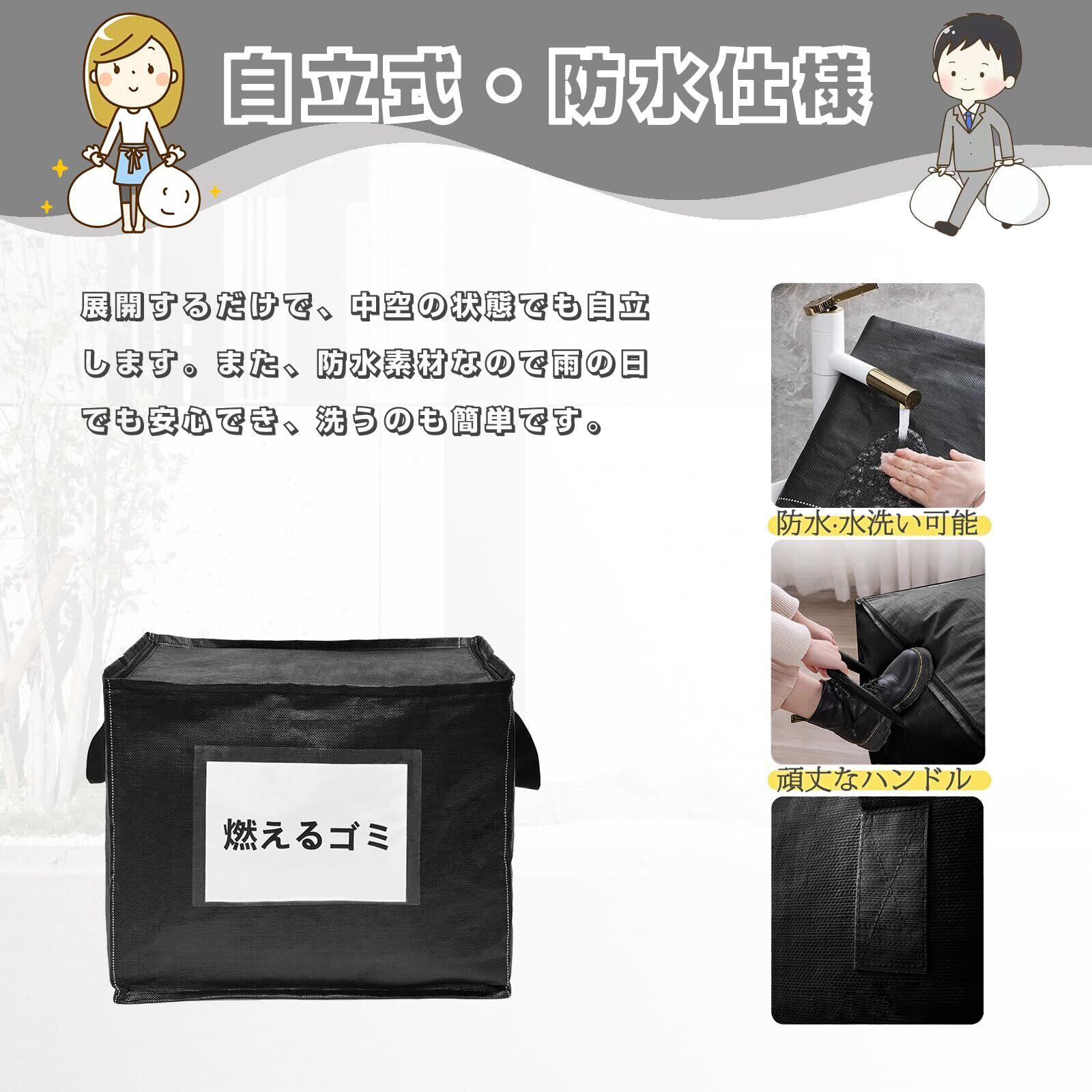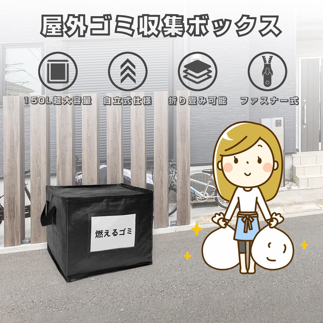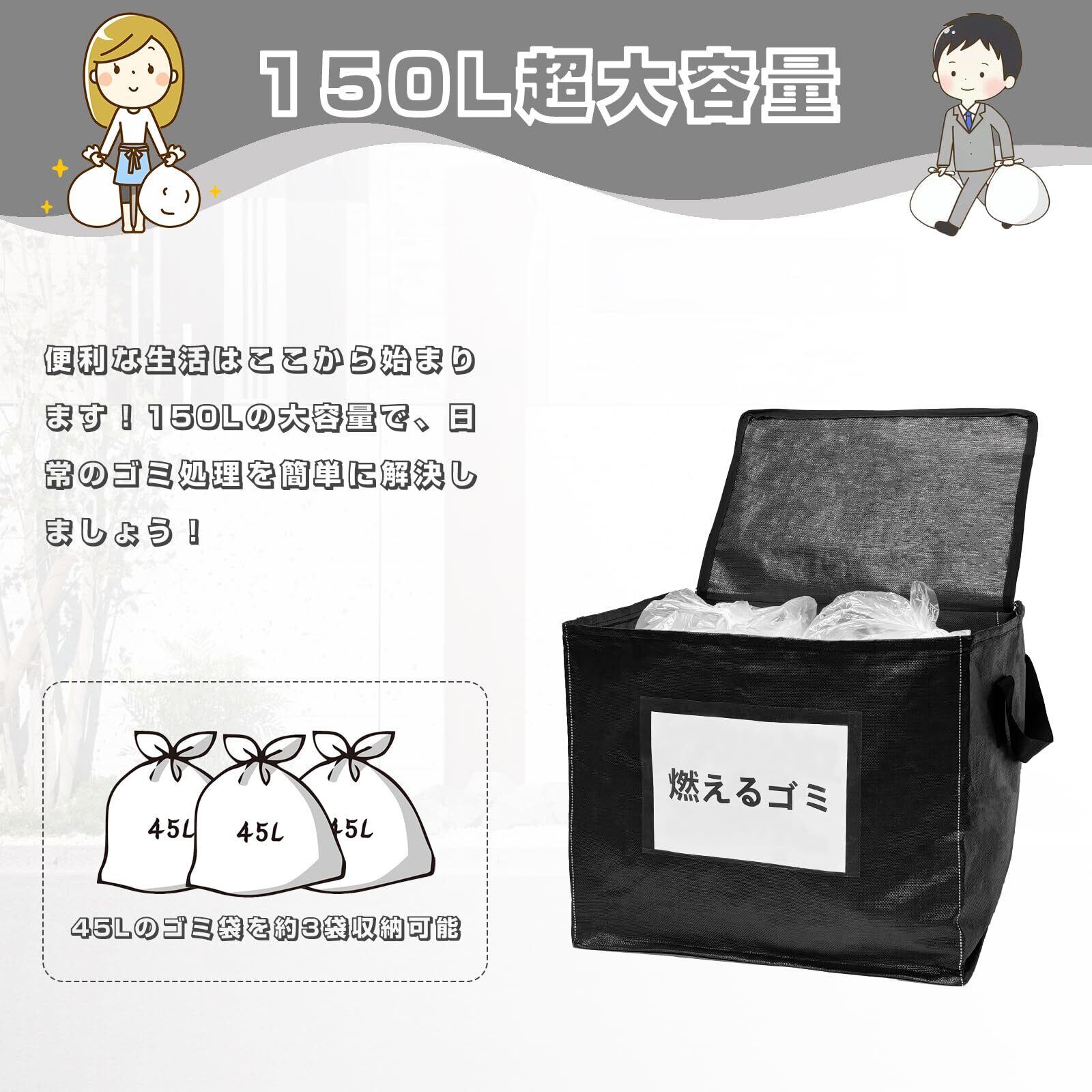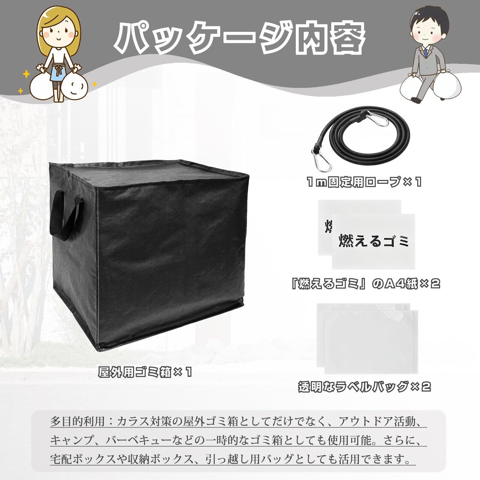 【150L超大容量】展開時のサイズは60×50×50CMで、3つの45Lのゴミ袋が収納可能です。個人や家庭での使用に最適で、ゴミ出しの他、ベランダなどで一時的にゴミを置く場所としても便利です。パッケージには、屋外用ゴミ箱×1、1メートル固定用ロープ×1、透明なラベルバッグ×2、そして「燃えるゴミ」のA4紙×2が含まれています。