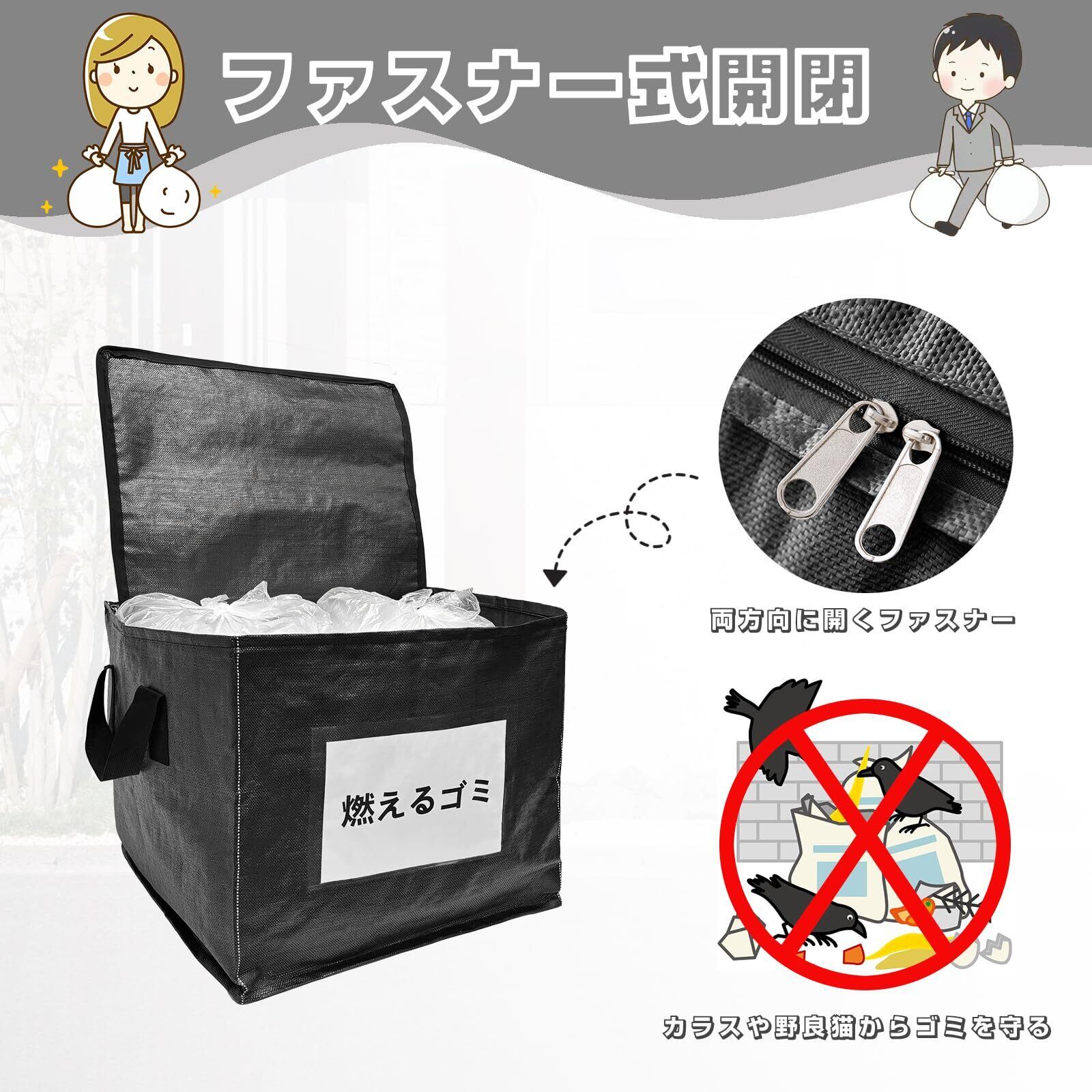 【ファスナー式開閉】ゴミ箱の上部には両方向に開くファスナーが備わっており、大きな開口部の設計で、ゴミを簡単に出し入れできます。メッシュタイプではなく、メッシュのゴミ箱やゴミネットよりも丈夫で耐久性があり、カラスや野良猫の侵入を効果的に防ぎ、ゴミの散乱を防止します。