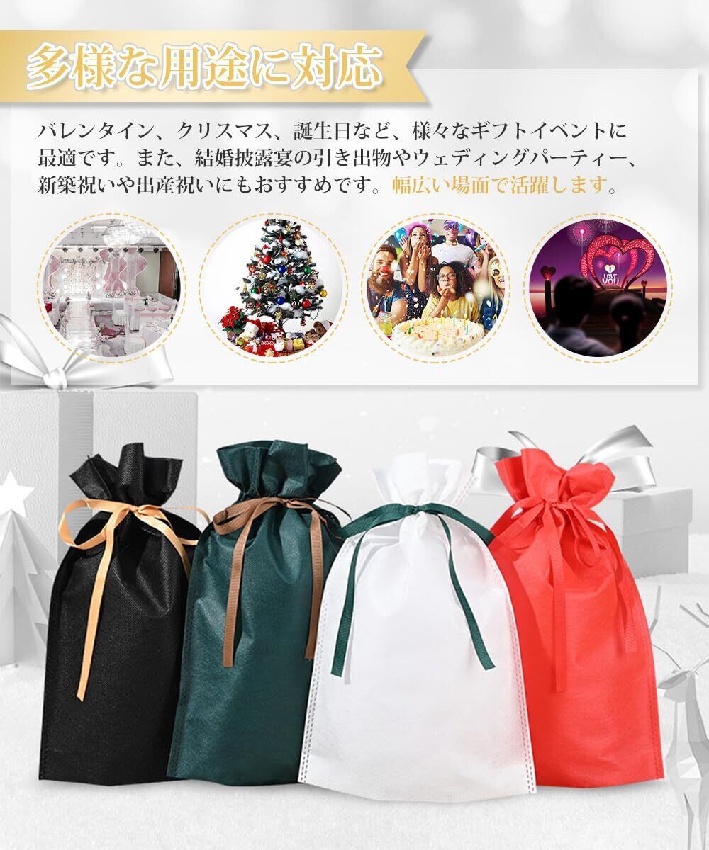 プレゼント包装に最適な8枚セット:赤・緑・白・黒の4種類のカラフルなラッピング袋がセットになっています。贈る相手やイベントに合わせて使い分けることができます。メッセージカードもセットされており、心のこもったメッセージを添えることができます。