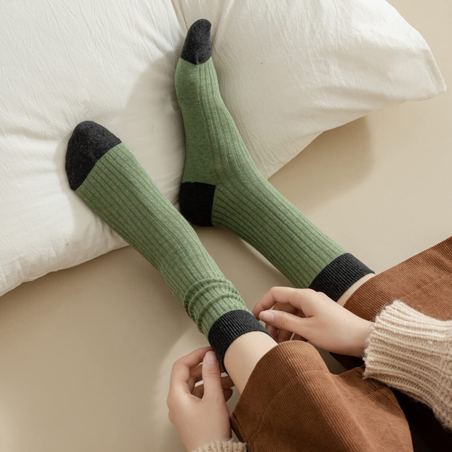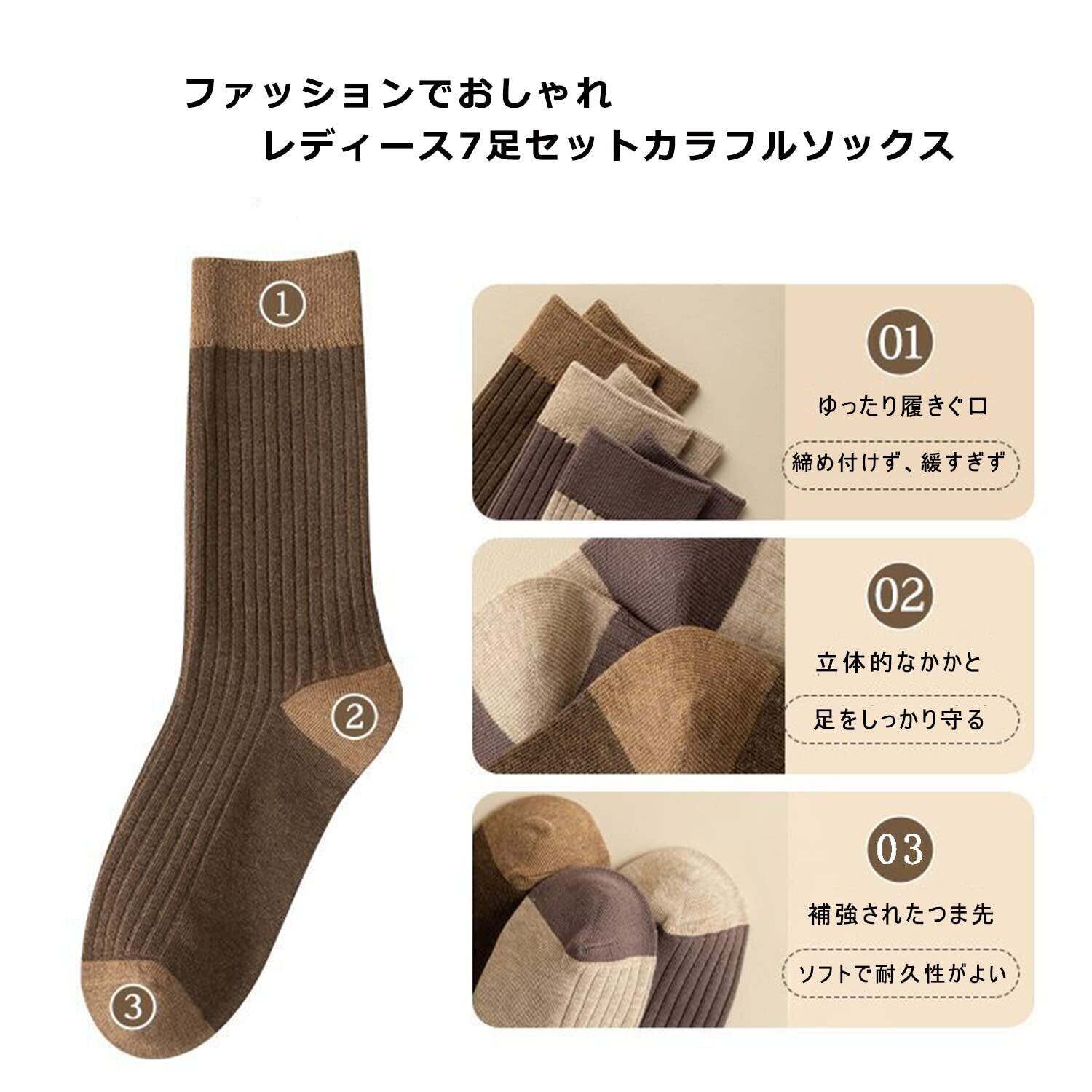 【7色7足セット 靴下 レディース】カラーバリエーション豊富な7足組 女性靴下 保温性、ベーシックから明るめなカラーまで、色々なコーデに合わせやすいシンプルデザインなおしゃれ靴下 レディース クルーソックスです。長ズボンやパンツの隙間からソックスが見えてもあまり目立たず、全体がバランスよいレディースくつした綿。