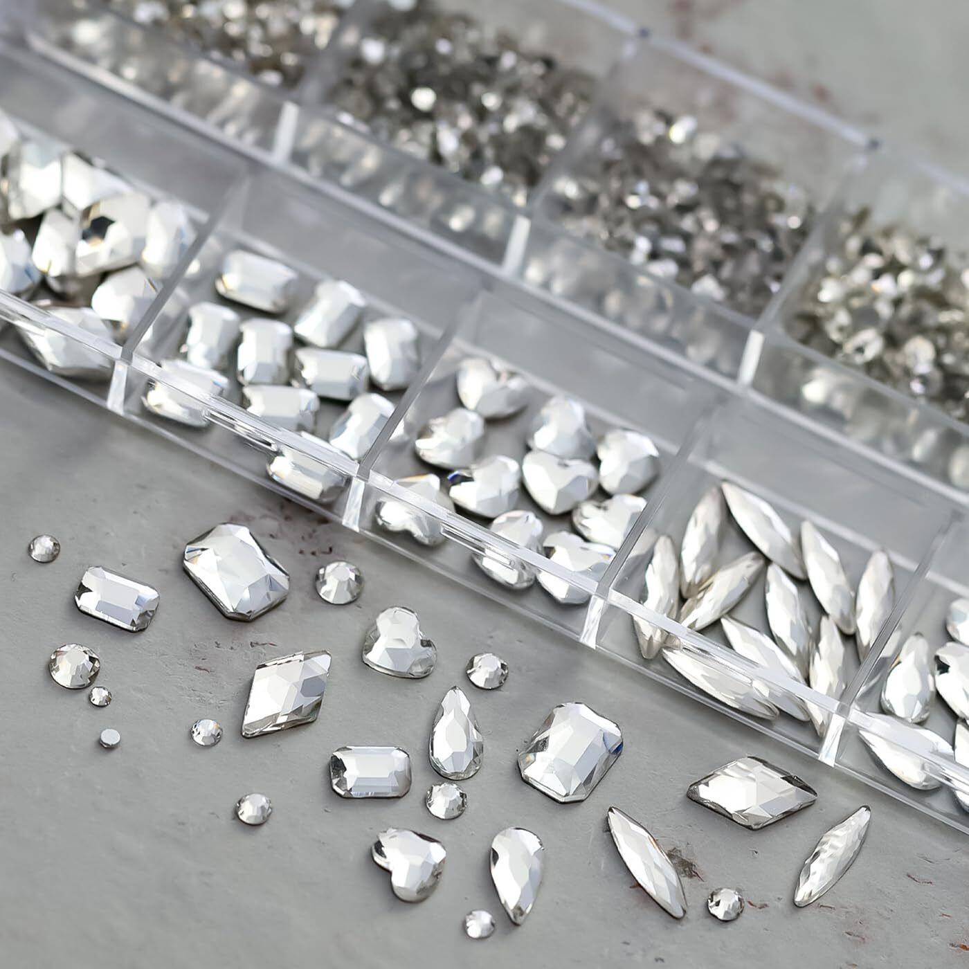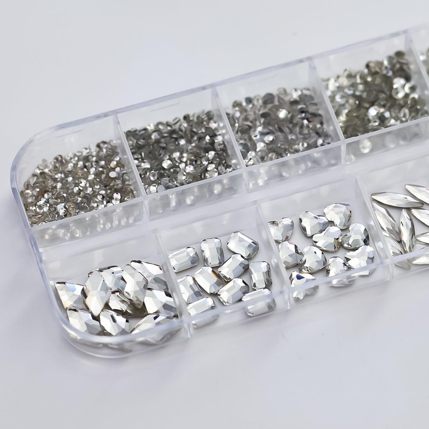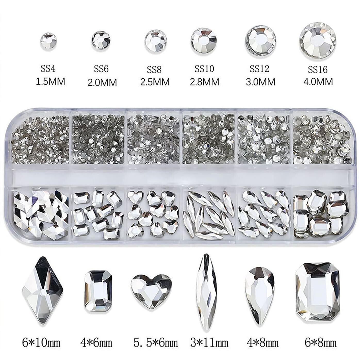 【仕様】サイズ:1.5 mm から 10 mm まで多様。重量:約30g/箱。カラー:白。素材:ガラスラインストーン。入数:約1130個。