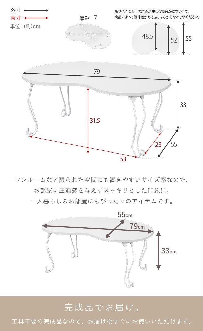 折りたたみ脚のビーンズ型テーブル。 丸形や楕円型とも違うオシャレなデザインの天板がポイント。 真っ白なホワイトカラーと猫脚が甘さを足してくれます。 韓国インテリアやホワイトインテリア、姫系インテリアなど、 幅広い女子部屋のテイストにマッチ。 コンパクトサイズなのでひとり暮らしのお部屋や子供部屋にも合わせやすいです。 さらに折れ脚テーブルなので、 普段はベッド下や家具の隙間に収納しておいて、 必要な時にサッと出すことも。 組み立て不要の完成品なので、お届け後すぐに使うことができます。 【商品サイズ(約)】幅79×奥行55×高さ33cm 【梱包サイズ(約)】幅85×奥行59×高さ7cm 【梱包重量(約)】15.1kg 【材質】 天板:メラミン樹脂化粧繊維板 脚部:スチール(粉体塗装) 【生産国】中国 【備考】完成品