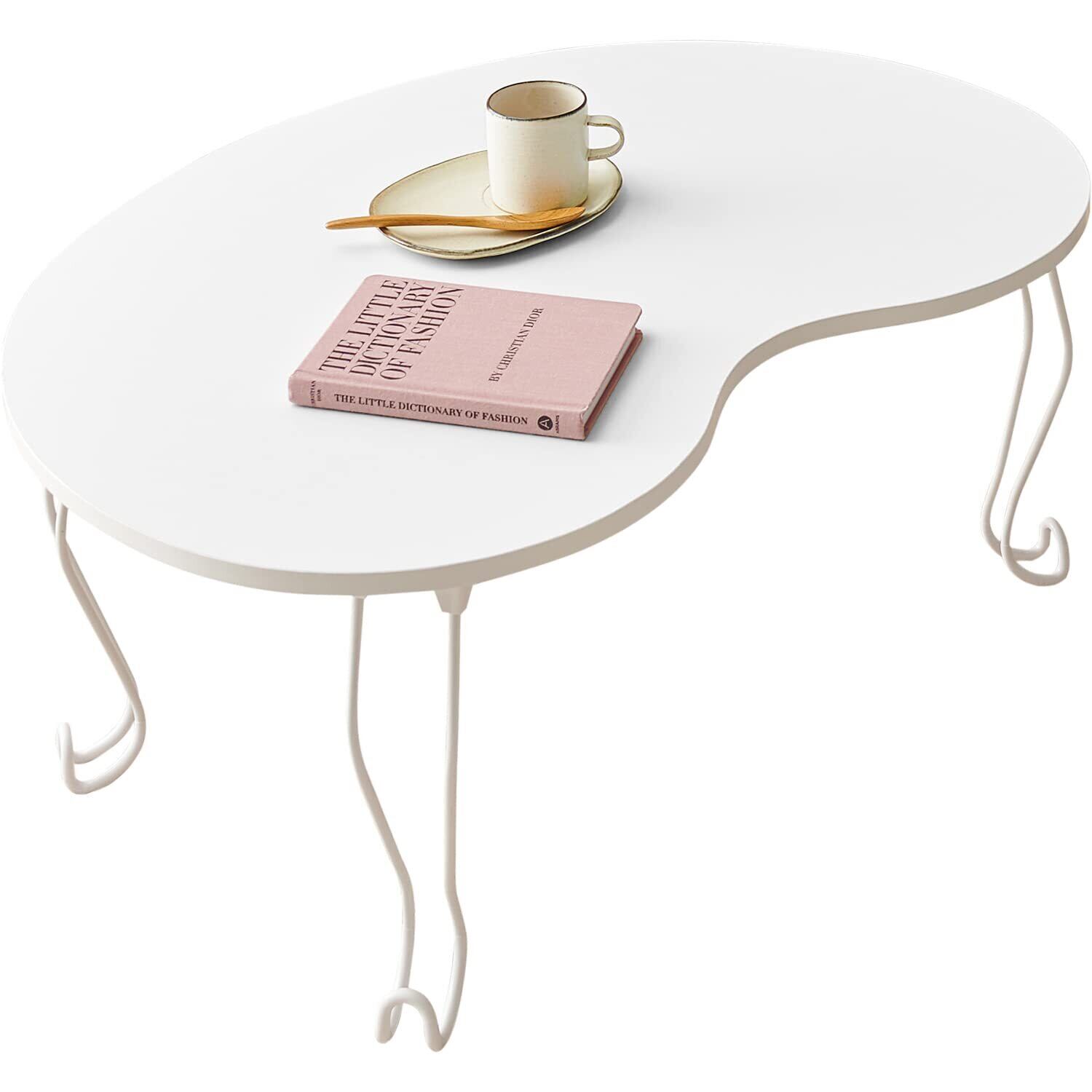 折りたたみ脚のビーンズ型テーブル。 丸形や楕円型とも違うオシャレなデザインの天板がポイント。 真っ白なホワイトカラーと猫脚が甘さを足してくれます。