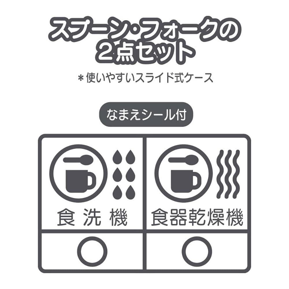 スプーン・フォークの2点セット。使いやすいスライド式ケース。名前シール付き。抗菌。食洗機、食器乾燥機使用可能。煮沸はお避けください。