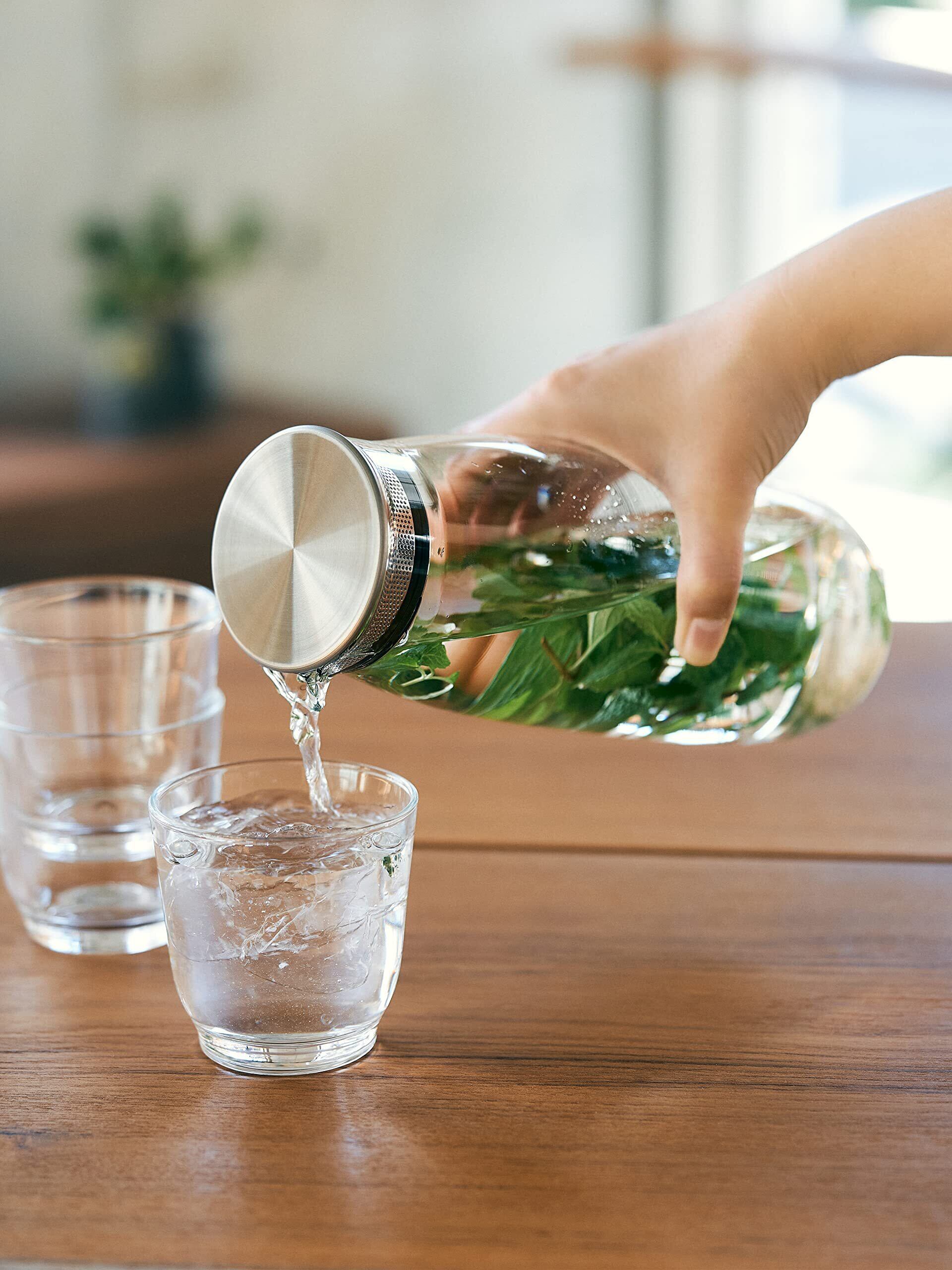 冷蔵庫のドアポケットに収まるサイズで、蓋は注ぐたびに開け閉めする必要がなく、氷やレモンなどを留めながら注げる設計です。付属の細かいメッシュストレーナーに茶葉を入れて水を注ぐだけで、水出しのアイスティーを手軽に作ることができます。