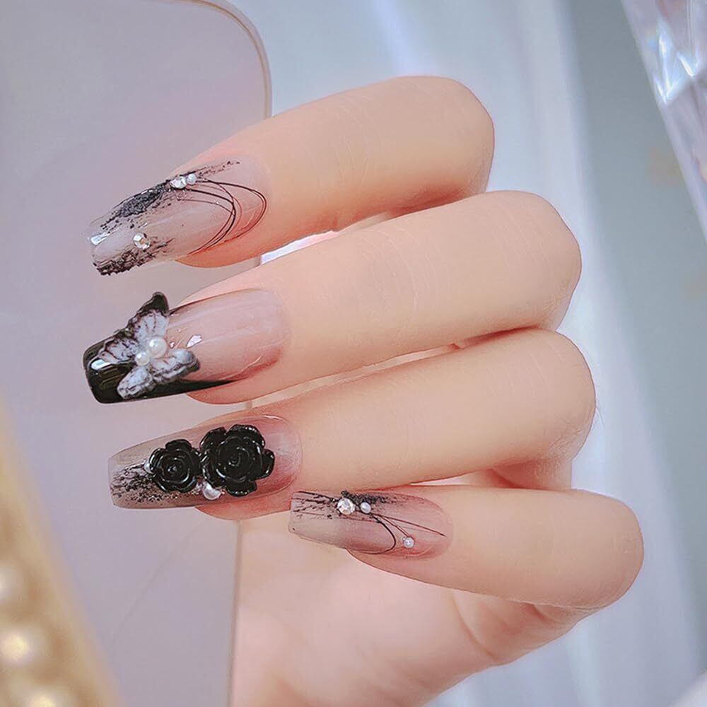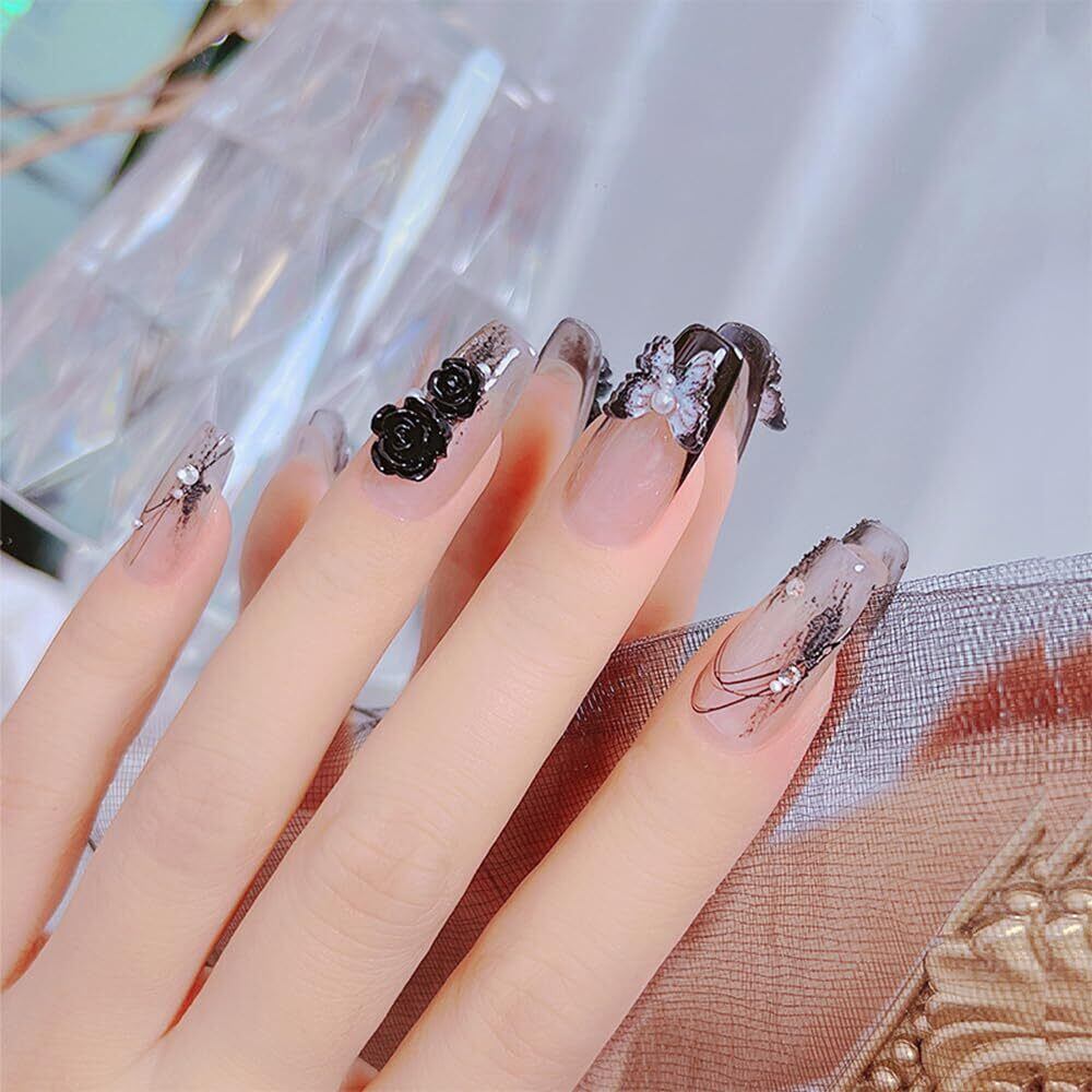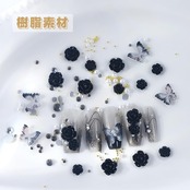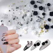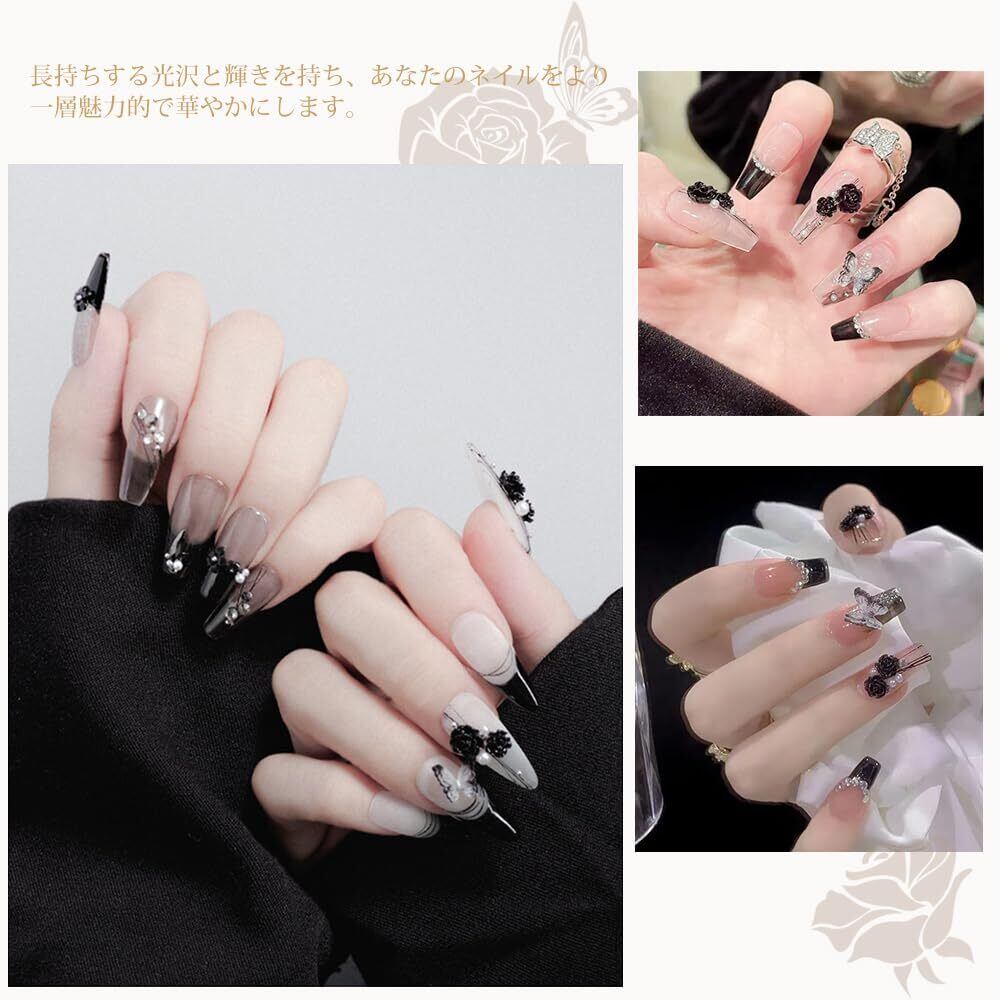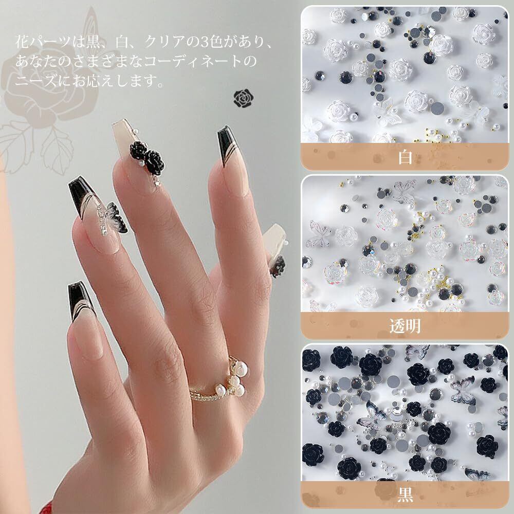 【特価商品】UrbanPulse ネイルパーツ 花 立体 3D 大きめ ネイルパーツセット バラ 蝶々 カメリア 椿 デコパーツ ストーン パール ブリオン ジュエリーパーツ (黒+白+クリア)