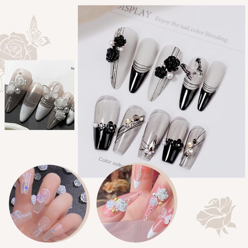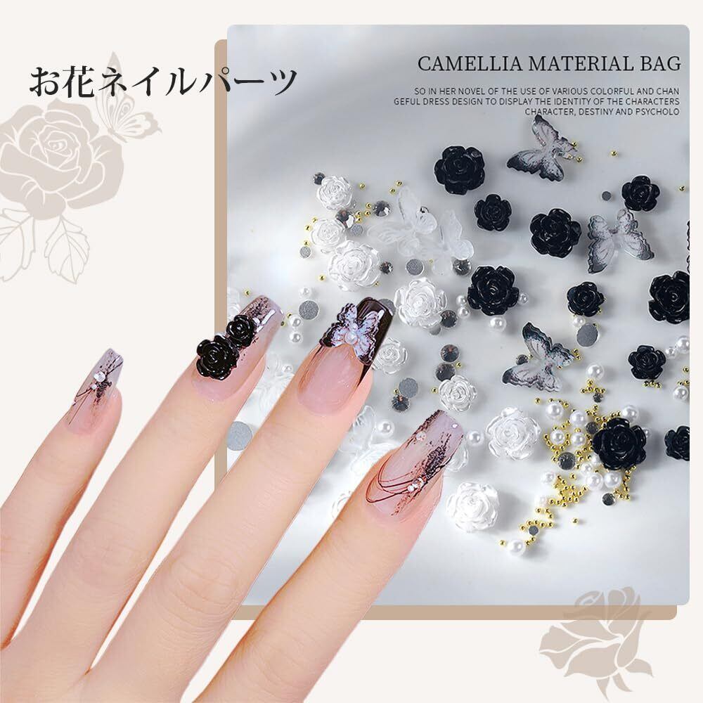 UrbanPulse ネイルパーツ 花 立体 3D 大きめ ネイルパーツセット バラ 蝶々 カメリア 椿 デコパーツ ストーン パール ブリオン ジュエリーパーツ (黒+白+クリア)