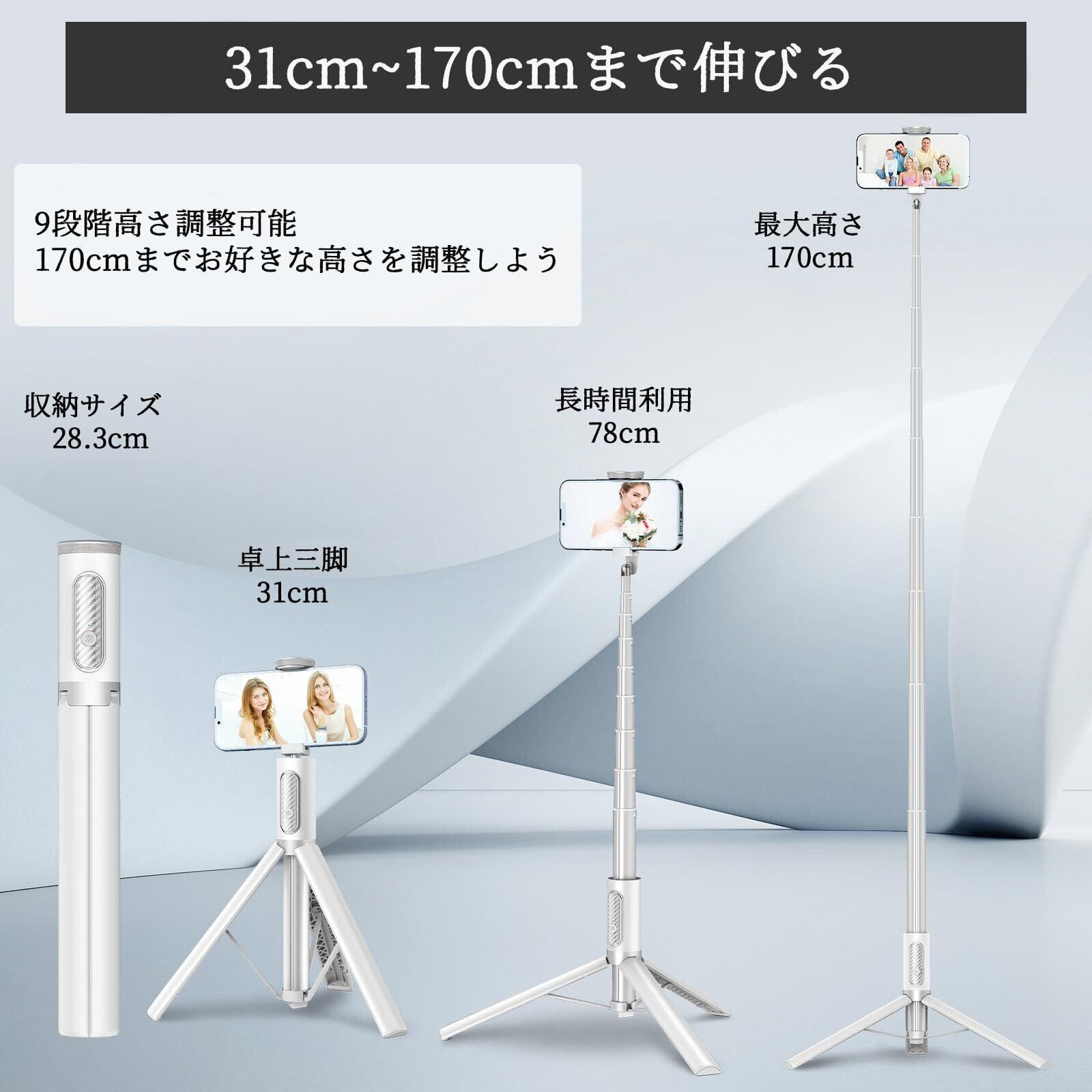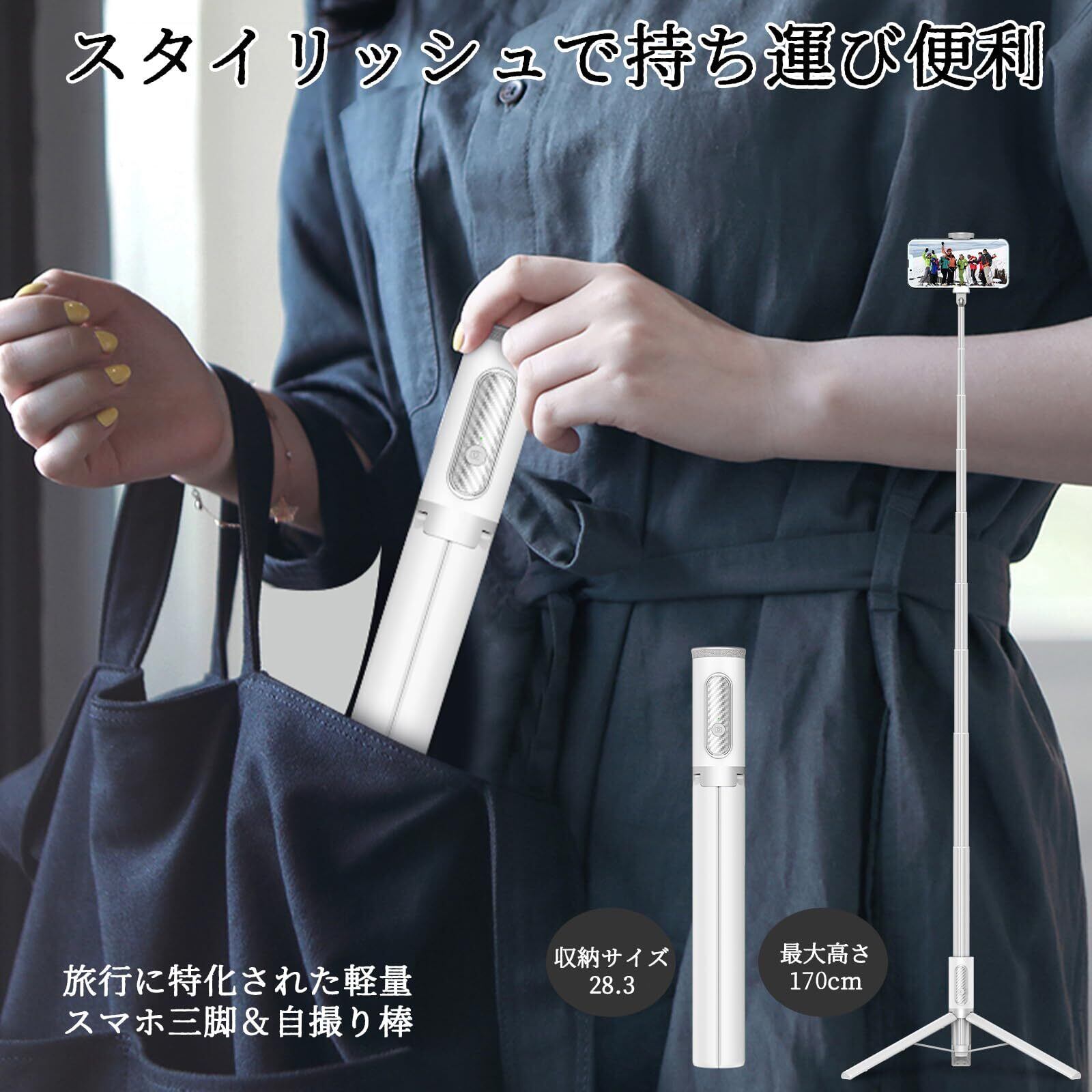 持運びやすい&オシャレなスマホ三脚: スマホ三脚と自撮り棒を一体化させる理念に基づき、作られてきたこのスマートフォン用三脚は、スタイリッシュな仕様でコンパクトに折りたためられ、収納時にΦ3.65cm×28.3cmの円筒形(重さ333g)になり 旅行時にハンドバッグに入れることができ、持ち運びに特化された3脚です。単なる自撮り棒だけでなく、全部展開して撮影用のスマホ 三脚としても使用出来ます。最長170cmまで伸ばせてアウトドアでの撮影はもちろん、狭い室内での撮影においても場所を気にせずスマホをセットできます。