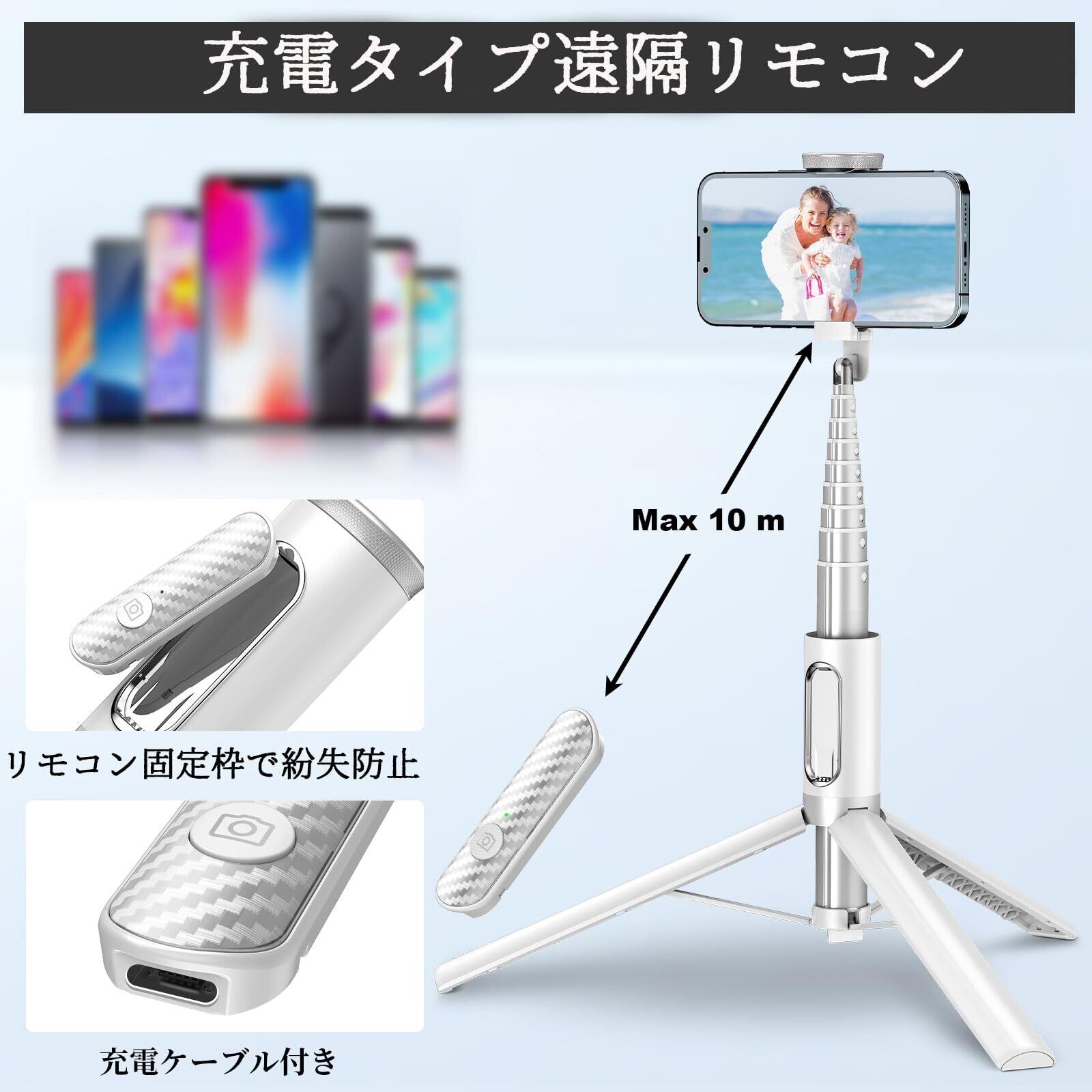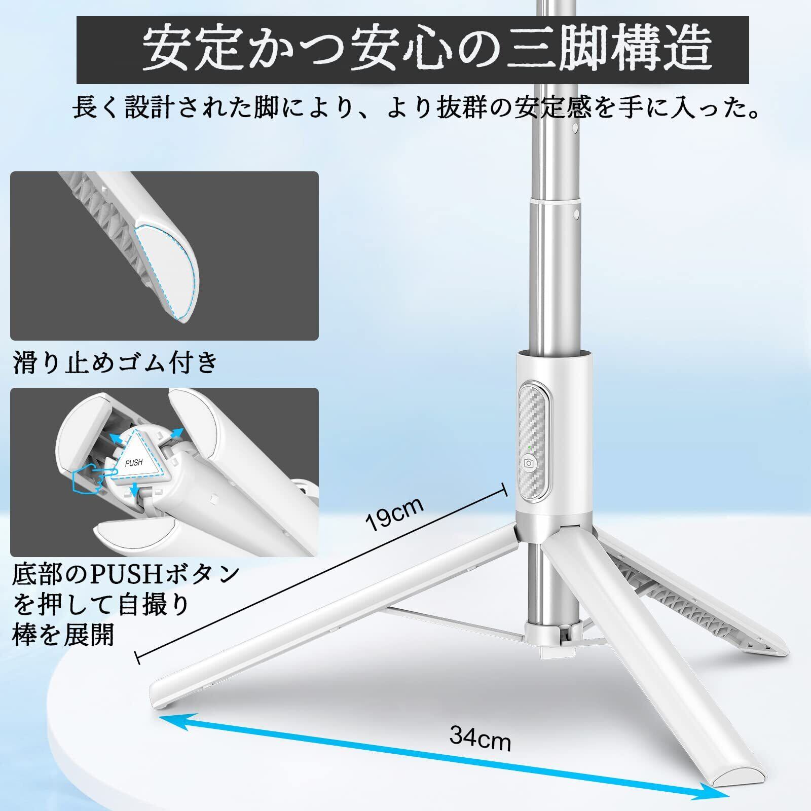 TONEOF スマホ 三脚 170cm 自撮り棒 セルカ棒 じどりぼう 遠隔リモコン 携帯 三脚 150cm以上 収納一体型 コンパクト 軽量 安定 ロング iPhone&Androidに対応 (白)