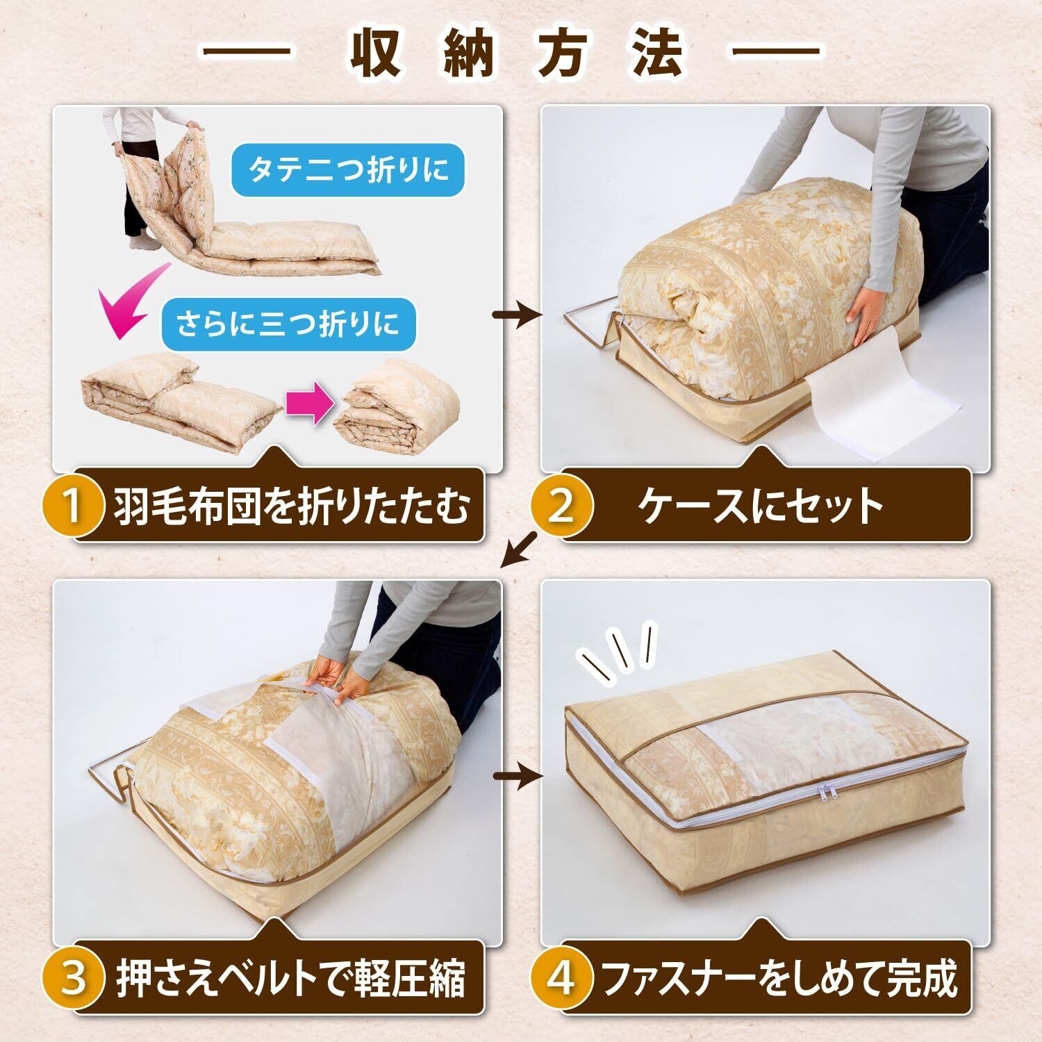 ●かさばりがちな羽毛布団をすっきりコンパクトに保管できる。せまい場所やすき間にも収納可能。