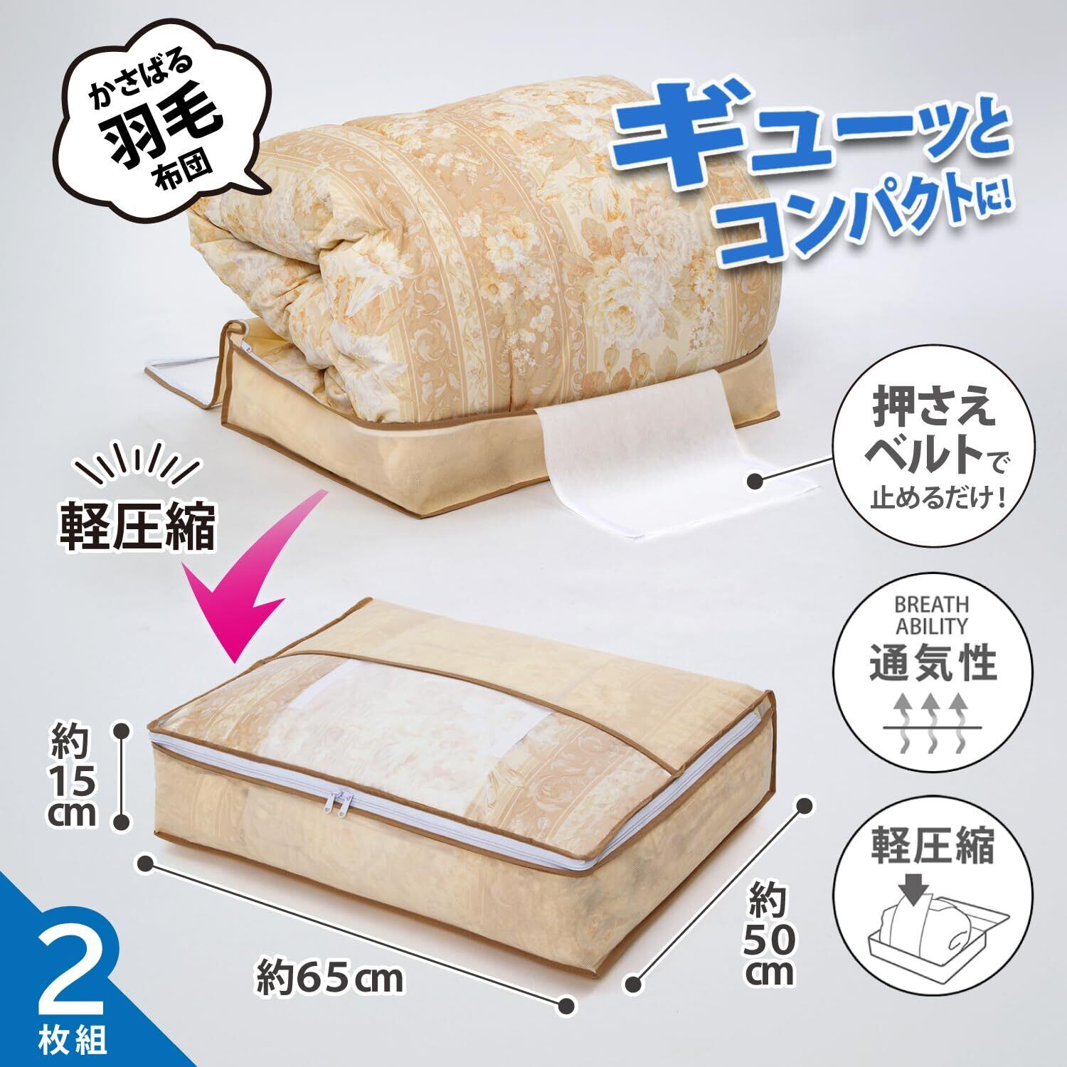 【商品仕様】:本体サイズ/約幅65×奥行50×高さ15cm、内容/2枚組、カラー/ベージュ、材質/ポリプロピレン・ポリエチレン、収納目安/シングルサイズの羽毛布団1枚