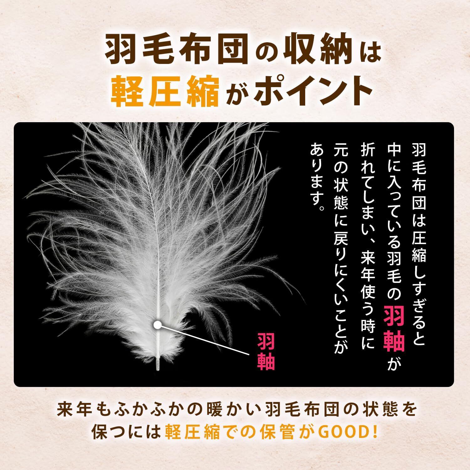 【簡単コンパクト収納】軽圧縮なので羽毛を傷めにくく、ふかふか感や暖かさを次のシーズンまでキープ。