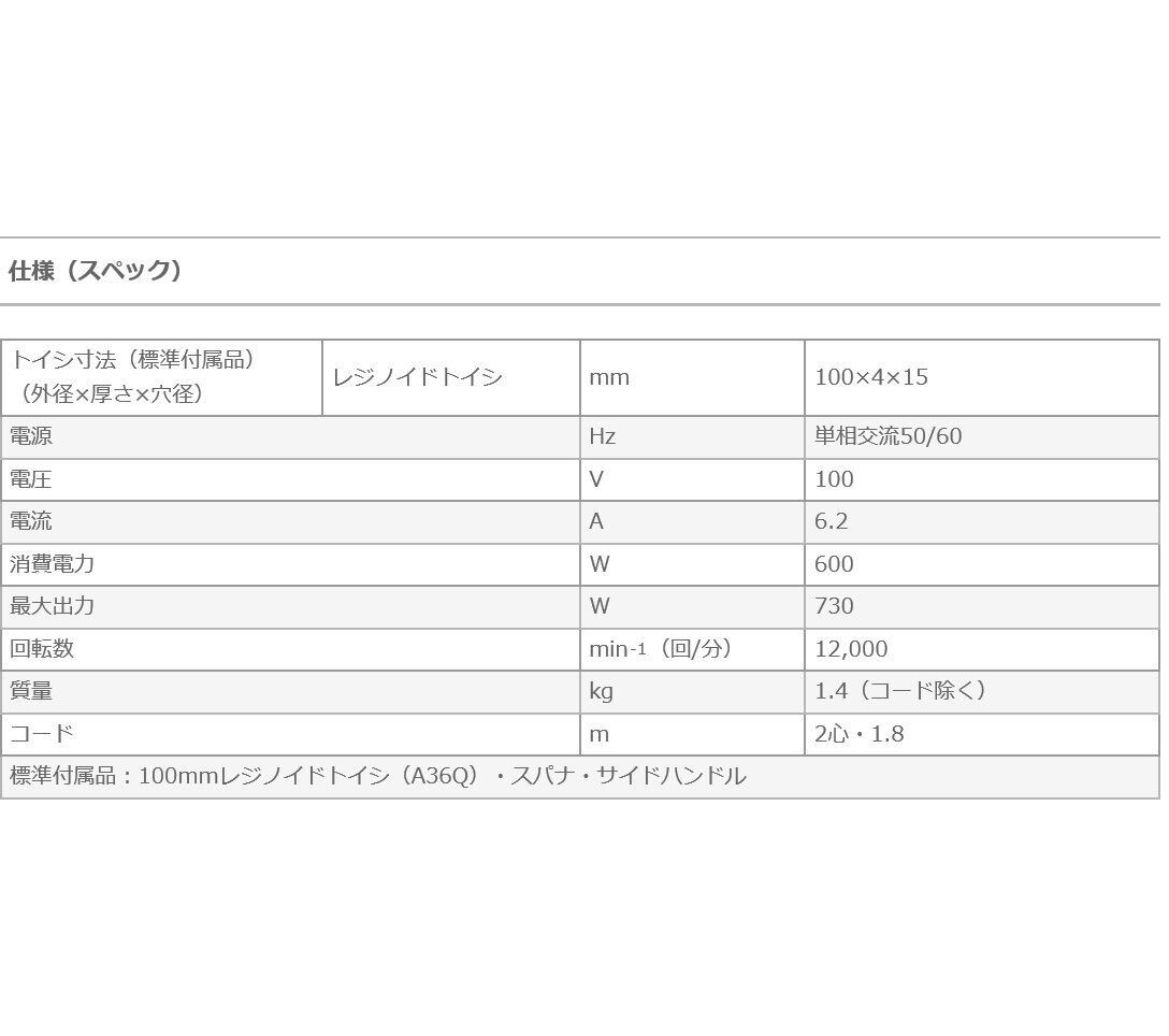 用途例:金属の塗装はがし(テーパ式多羽根ディスク(別売)使用)・木の研削作業(テーパ式多羽根木工サンダ(別売)使用)・コンクリートの筋付け(ダイヤモンドカッター・ガイドベース(別売)使用)・金属パイプの切断(切断トイシ・切断トイシ用ホイールガード・ガイドベース(別売)使用)