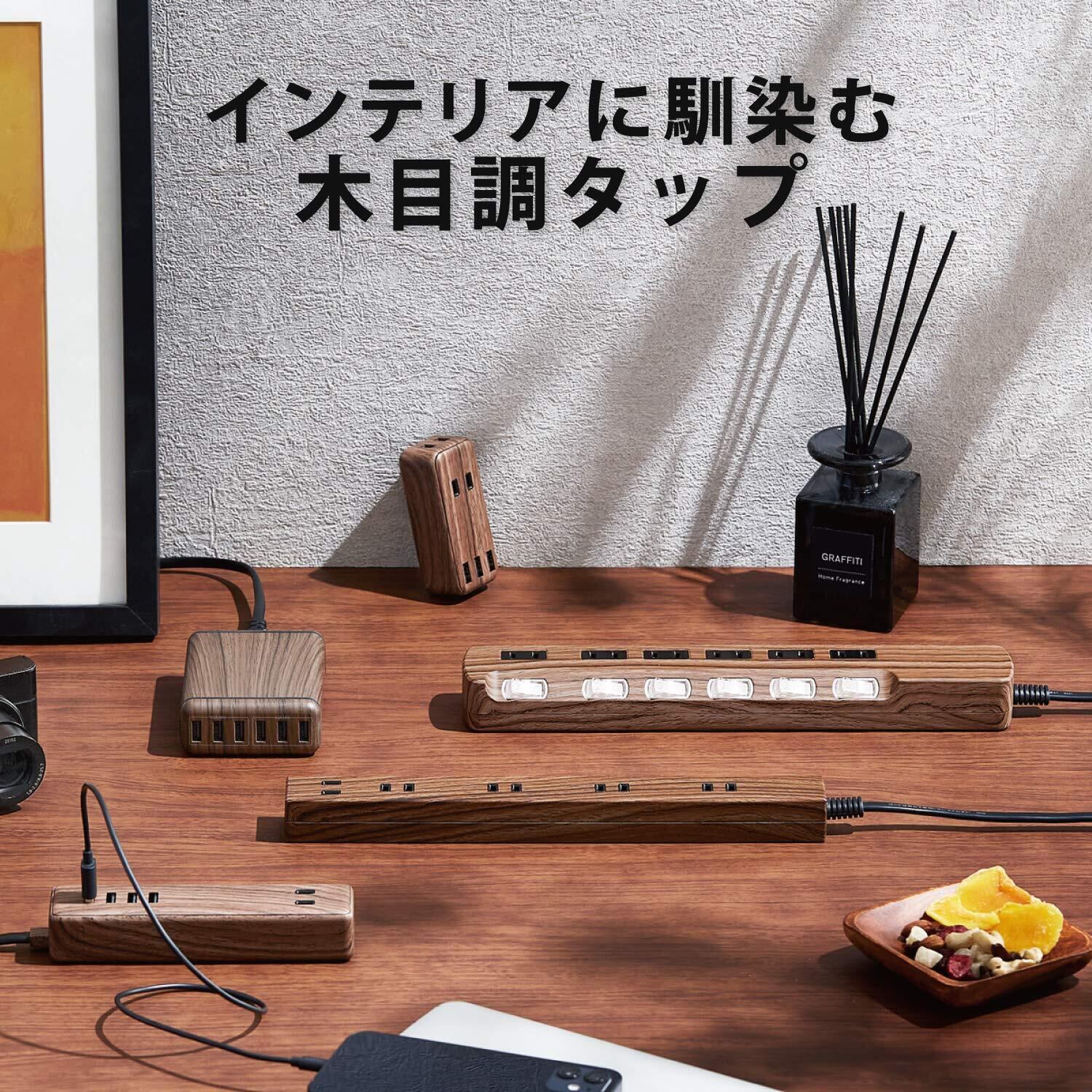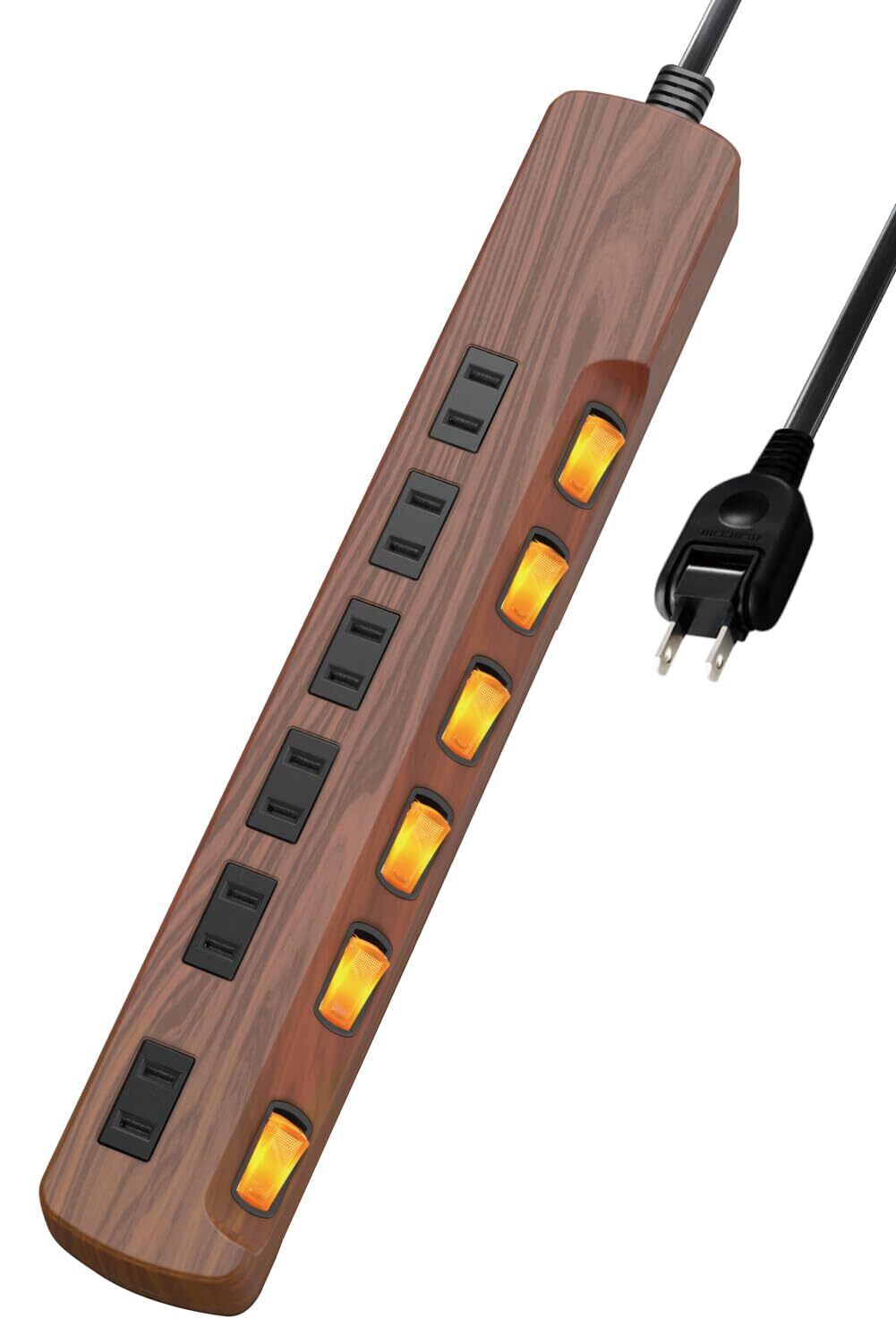 インテリアに馴染む木目調デザイン。パソコンやテレビなどの接続機器を誘導雷による雷サージから守る雷サージ吸収素子や、待機電力を節約する差込口毎のスイッチを搭載した6個口タップです。