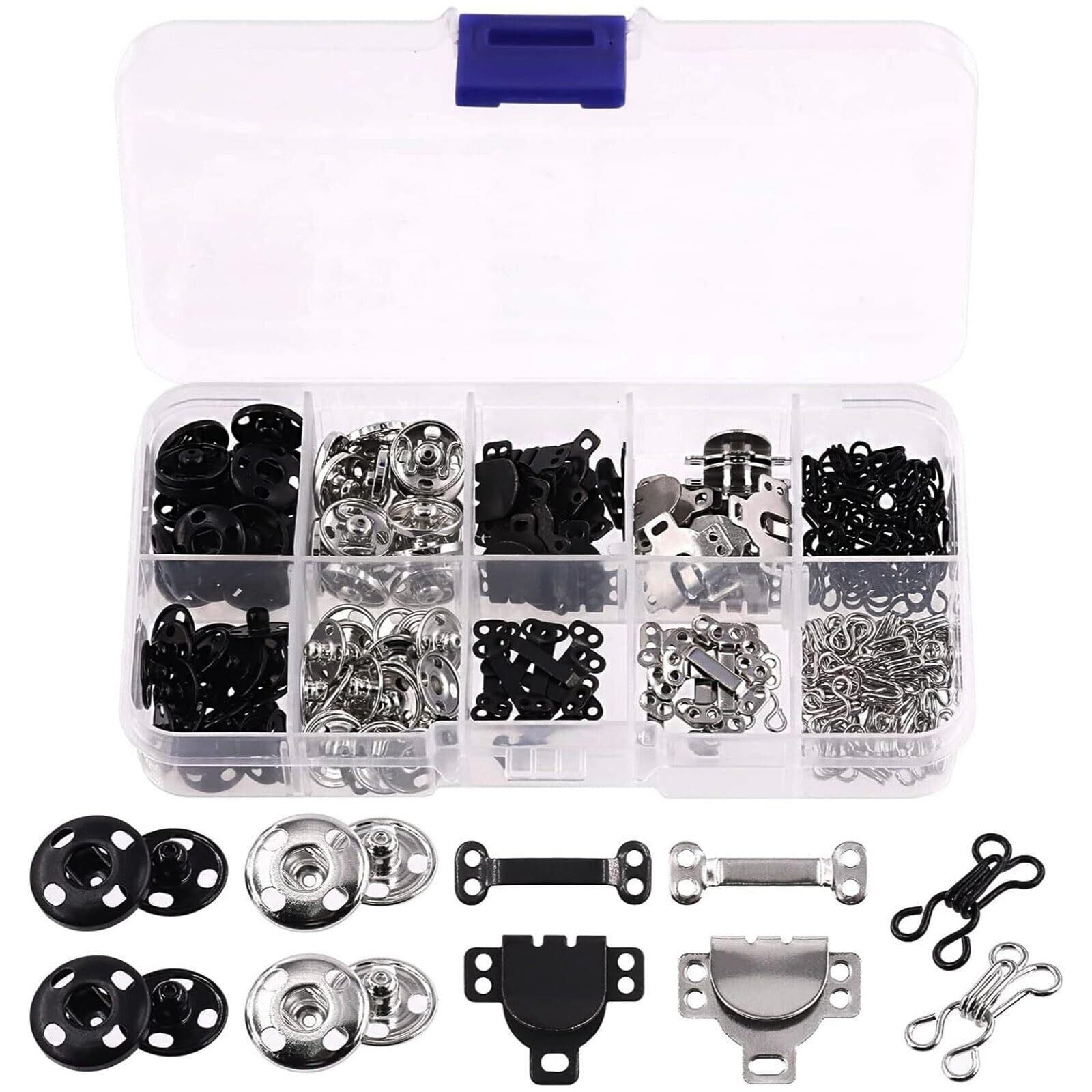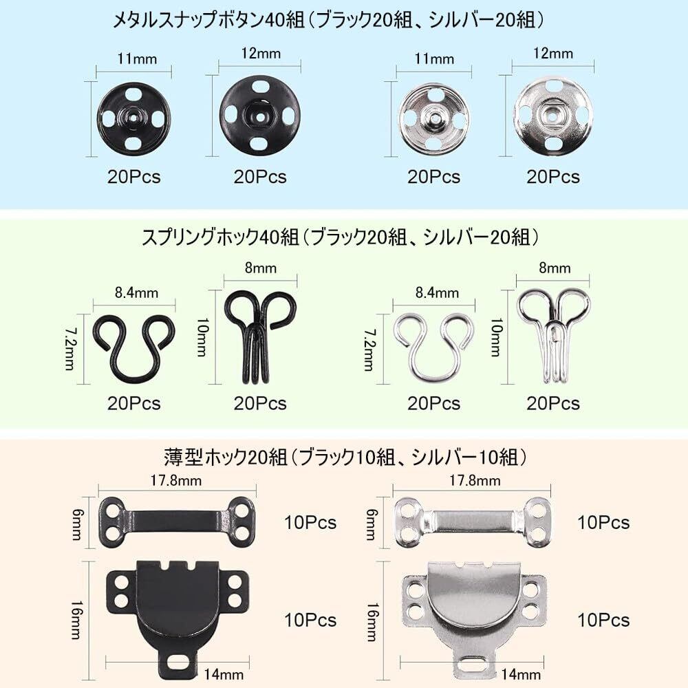 【パッケージ内容】3つのスタイルと2色:縫い付けスナップ40組(ブラック20組、シルバー20組)、ブラフックとアイ40組(ブラック20組、シルバー20組)、フックとアイラッチ20組(ブラック10組、シルバー10組)、合計200個。