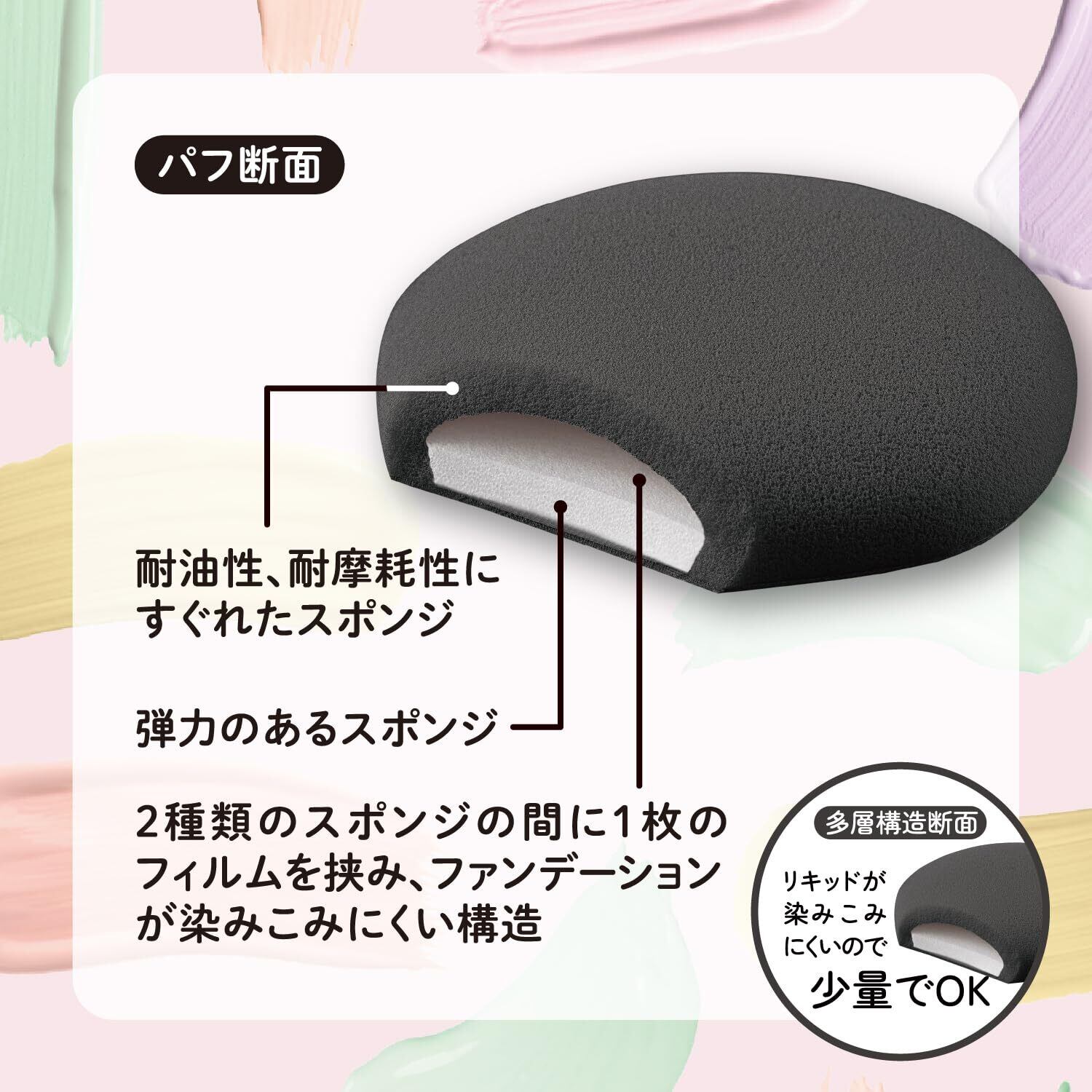 【ファンデーションが染み込みにくい構造】2種類のスポンジの間に1枚のフィルムを挟み、ファンデーションが染み込みにくい構造です。
