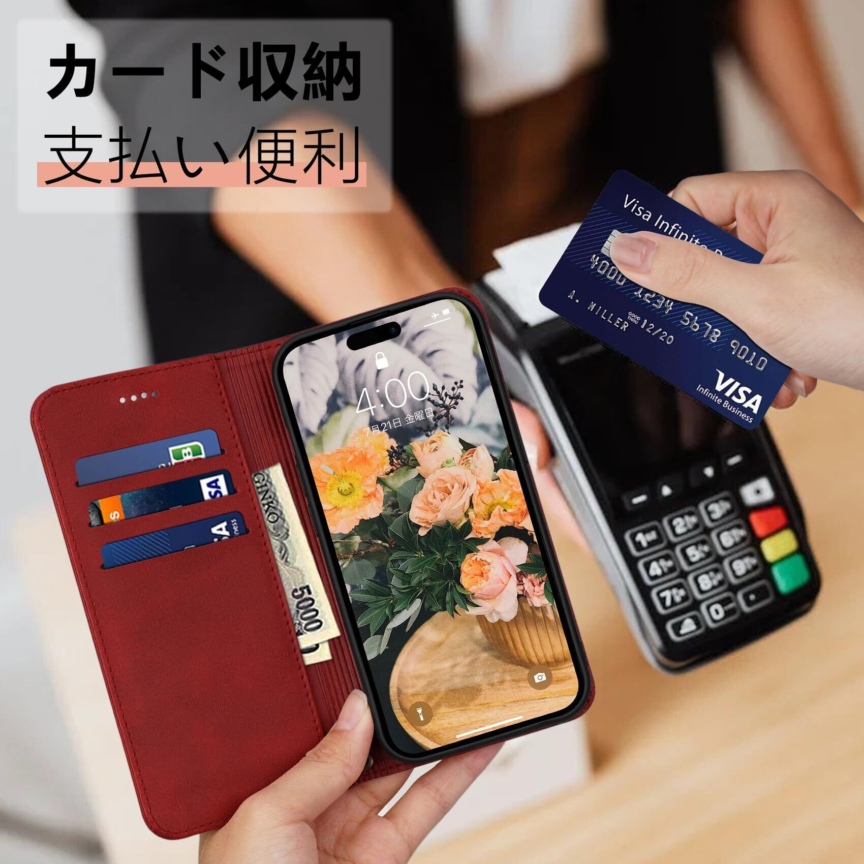カード収納:アイフォン 15 用 手帳型ケースの内側にはカード入れのポケットが付くため、重要な連絡先の名刺やクレジットカード十IDカードの収納に使用し、外出時はこのケースを携帯するだけで十分、日常の生活に便利です。なお、厚みのあるカード収納や、収納数により厚みがあるとフタが閉まらない事がございます。予めご了承下さい。
