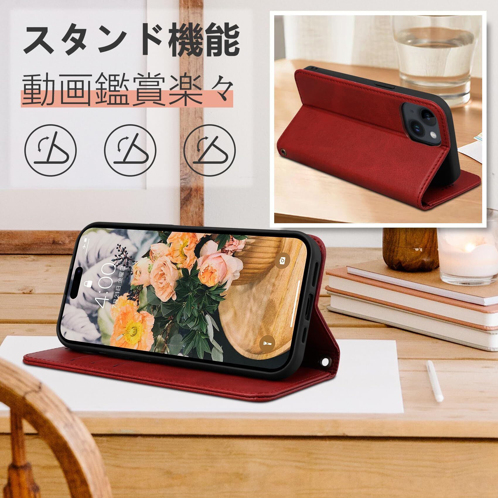 スタンド機能:このiPhone 15 専用 手帳型ケースはビジネスパーソンや長時間スマートフォンを使用する必要がある人に最適です。横置きのスタンド機能が付いて、好きな角度を調整して動画鑑賞や会議中にスライドショーを見たり、ビデオ会議に参加することができます。 このスマートフォンケースは耐久性があるものにし、折りたたみスタンドの機能を備えています。ユーザーの作業効率と生活品質を向上させることができます。