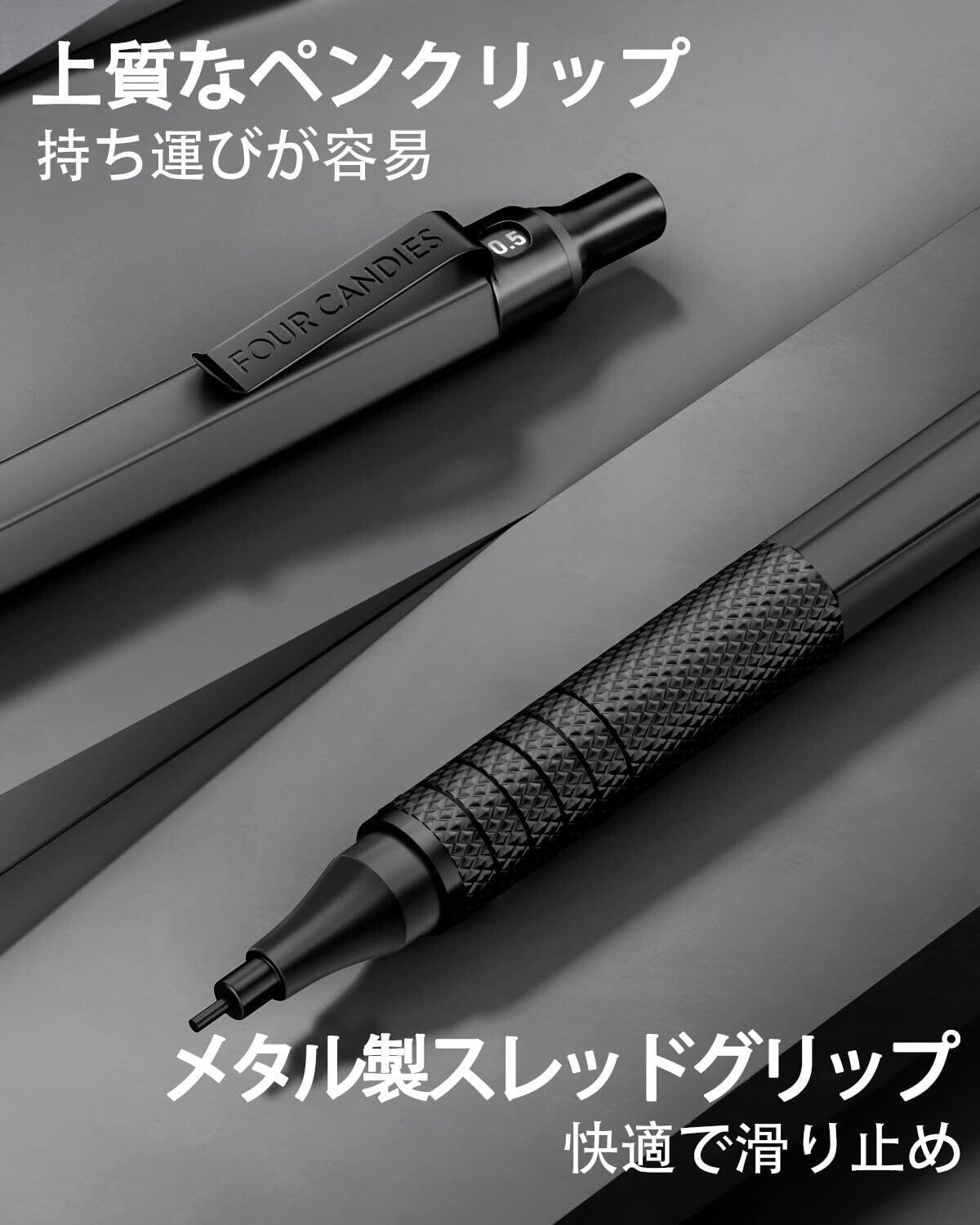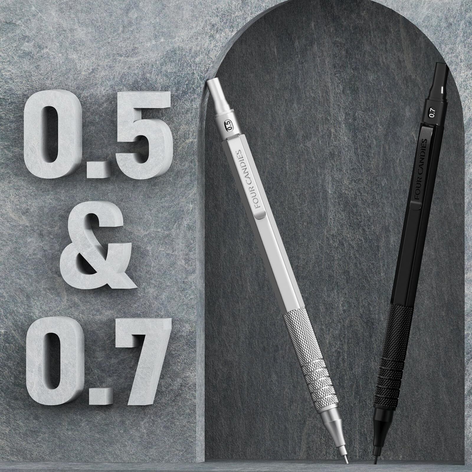 【新春セール】Four Candies メタルシャープペンシル 2本セット 0.5&0.7 mm シャーペン 360本HB替芯 消しゴム ケース付 文房具セット ブラック&シルバー