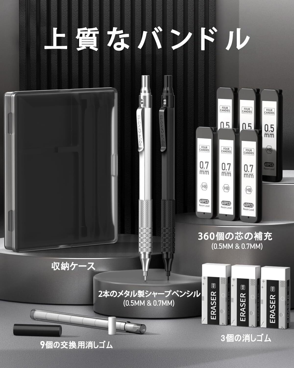 Four Candies メタルシャープペンシル 2本セット 0.5&0.7 mm シャーペン 360本HB替芯 消しゴム ケース付 文房具セット ブラック&シルバー