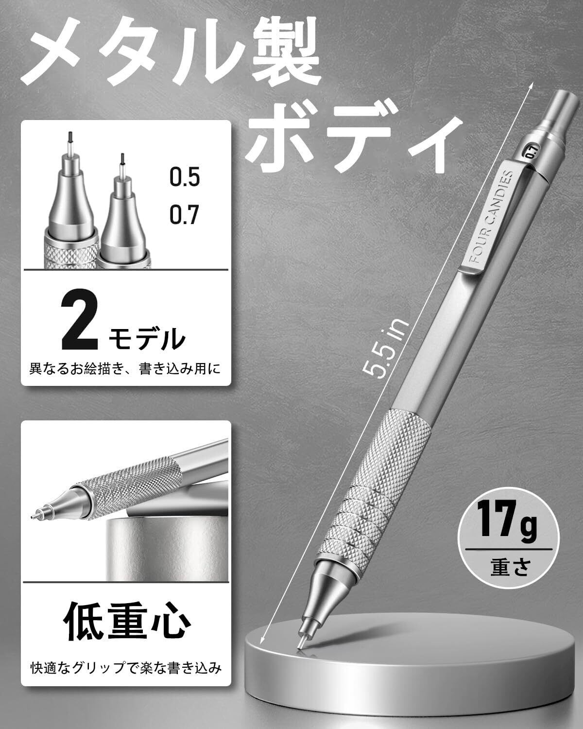 【新春セール】Four Candies メタルシャープペンシル 2本セット 0.5&0.7 mm シャーペン 360本HB替芯 消しゴム ケース付 文房具セット ブラック&シルバー | nico3588